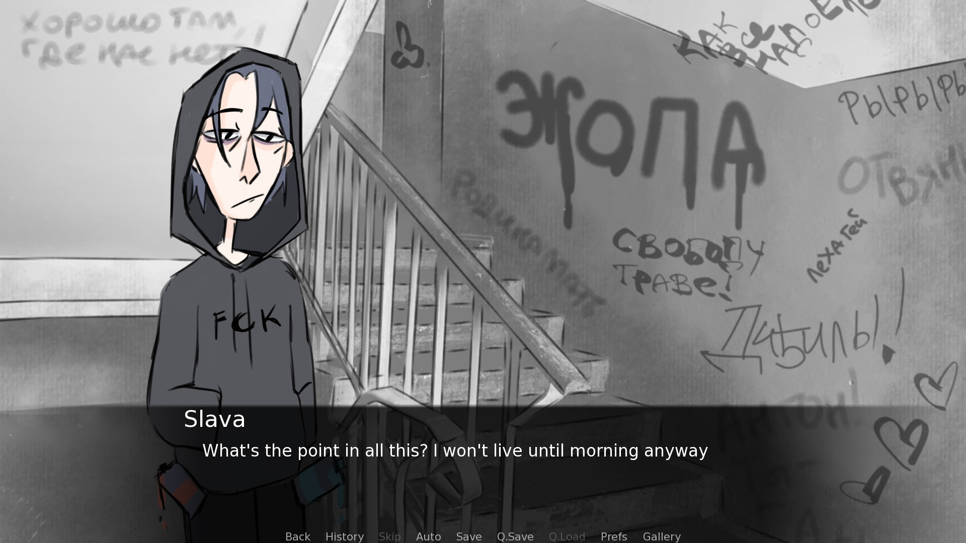 Slava is a former student, broken and destroyed by life. After a difficult breakup and expulsion from the university, he finds himself deeply depressed and comes to thoughts of suicide. However, before ending his worthless life, he needs to complete his will. This turns out to be quite a difficult task. Write down all your experiences and history on one piece of paper.... Slava needs to think carefully.