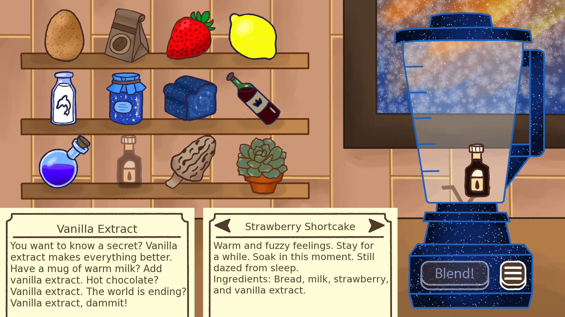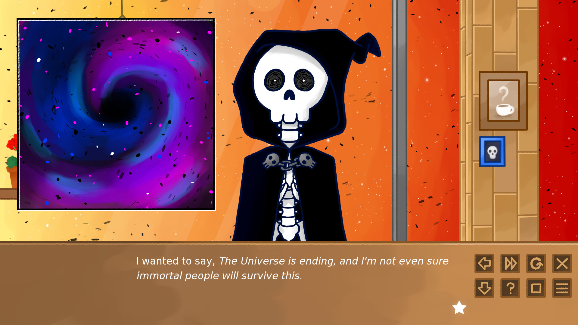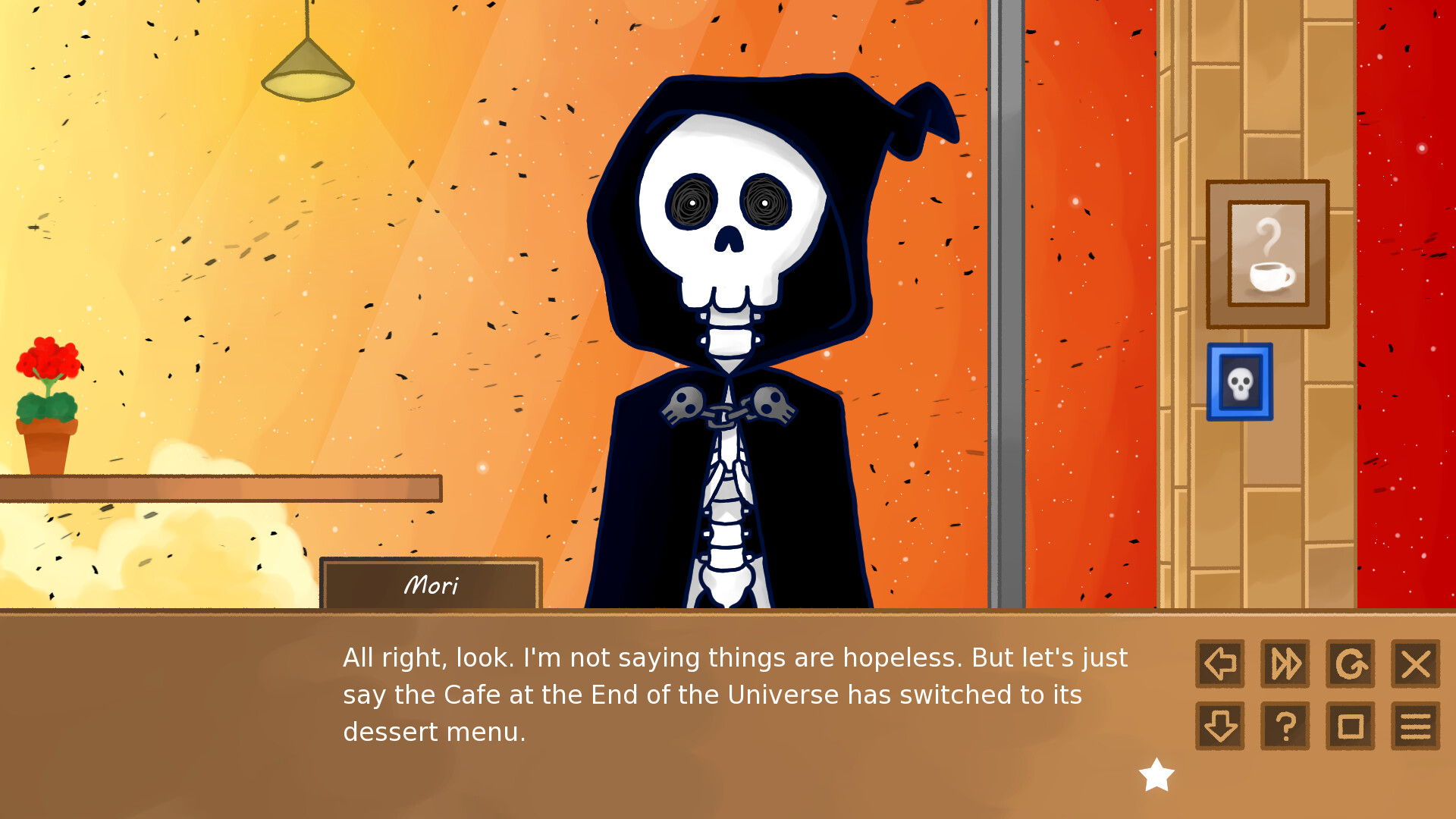 In a fantasy world where Halloween-themed monsters and witches are commonplace, the Universe is about to come to an end. A grim reaper is tasked with working at a cafe run by Death himself, serving patrons with a meal that recreates that person's most precious memory. itch.io]