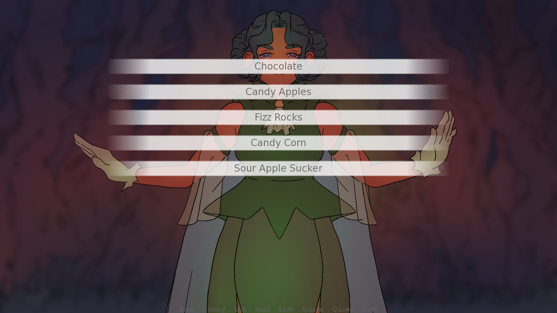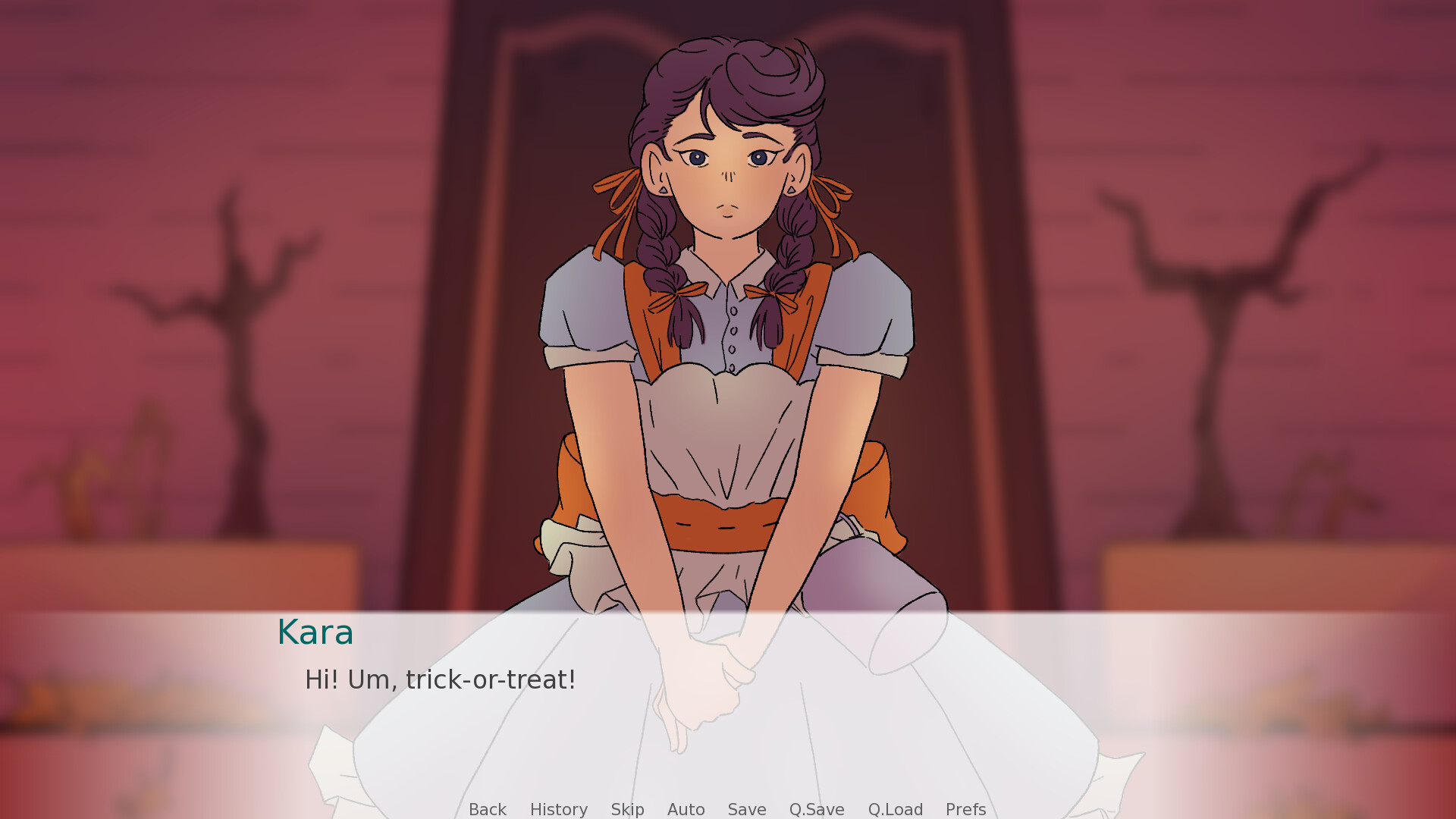 A 3rd-person visual novel where you play as Kara, a young woman going trick-or-treating on a mysterious street where you have to guess the candy in order to receive it.
