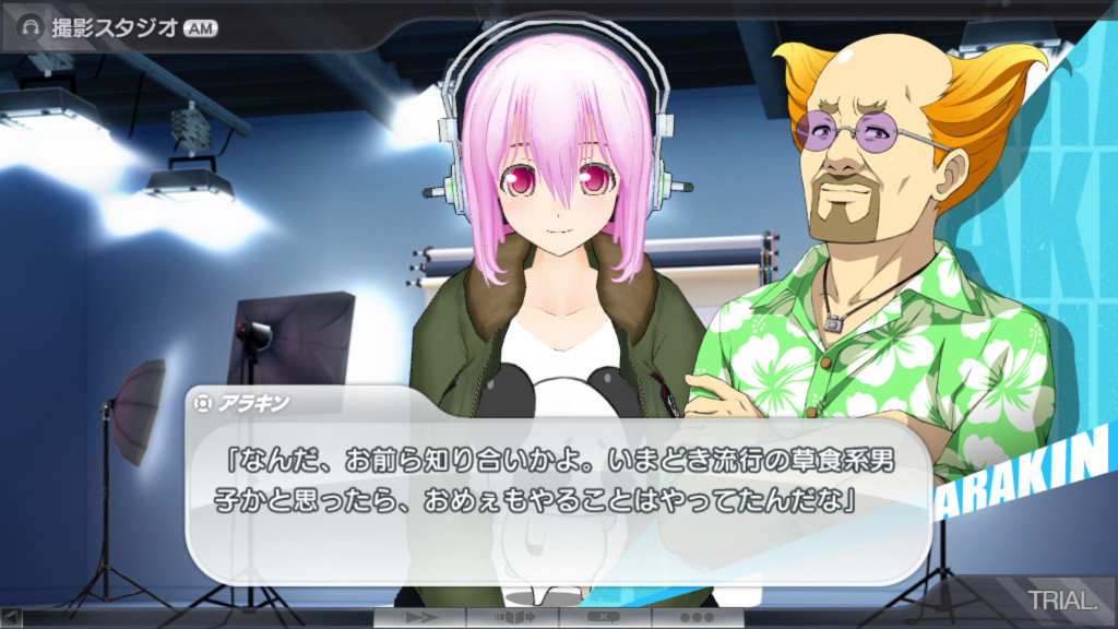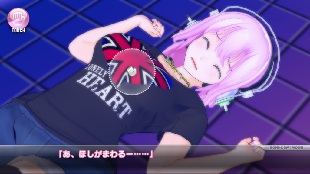 SoniComi is based on Sonico, an overly busty amateur idol and mascot of Nitroplus, and features players as her cameraman. Naturally as a cameraman, you will both film and court her. The game flow will consist of two phases: the adventure and action phase.