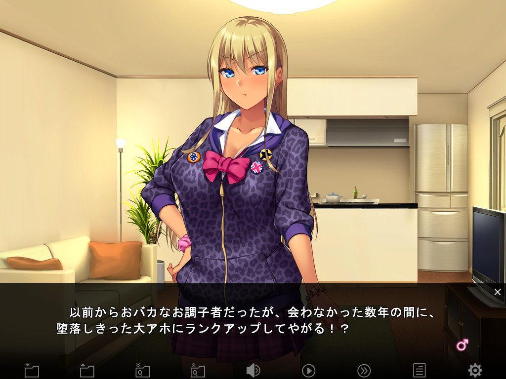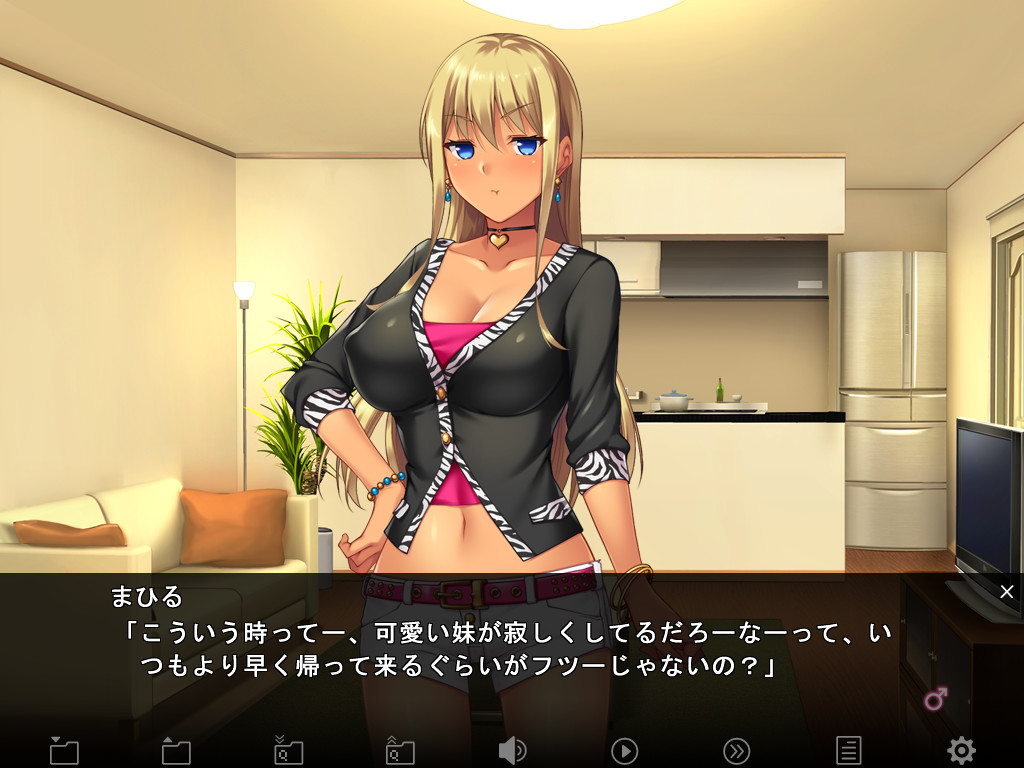 The protagonist of this game is an office worker who left home and started living alone in his apartment. One day, his sister who had gotten into a quarrel with their father and ran away from home, appears on his doorstep uninvited. It had been a while since they last met and so the protagonist is really surprised at her appearance: she has turned into a promiscuous blond-haired kogal!
