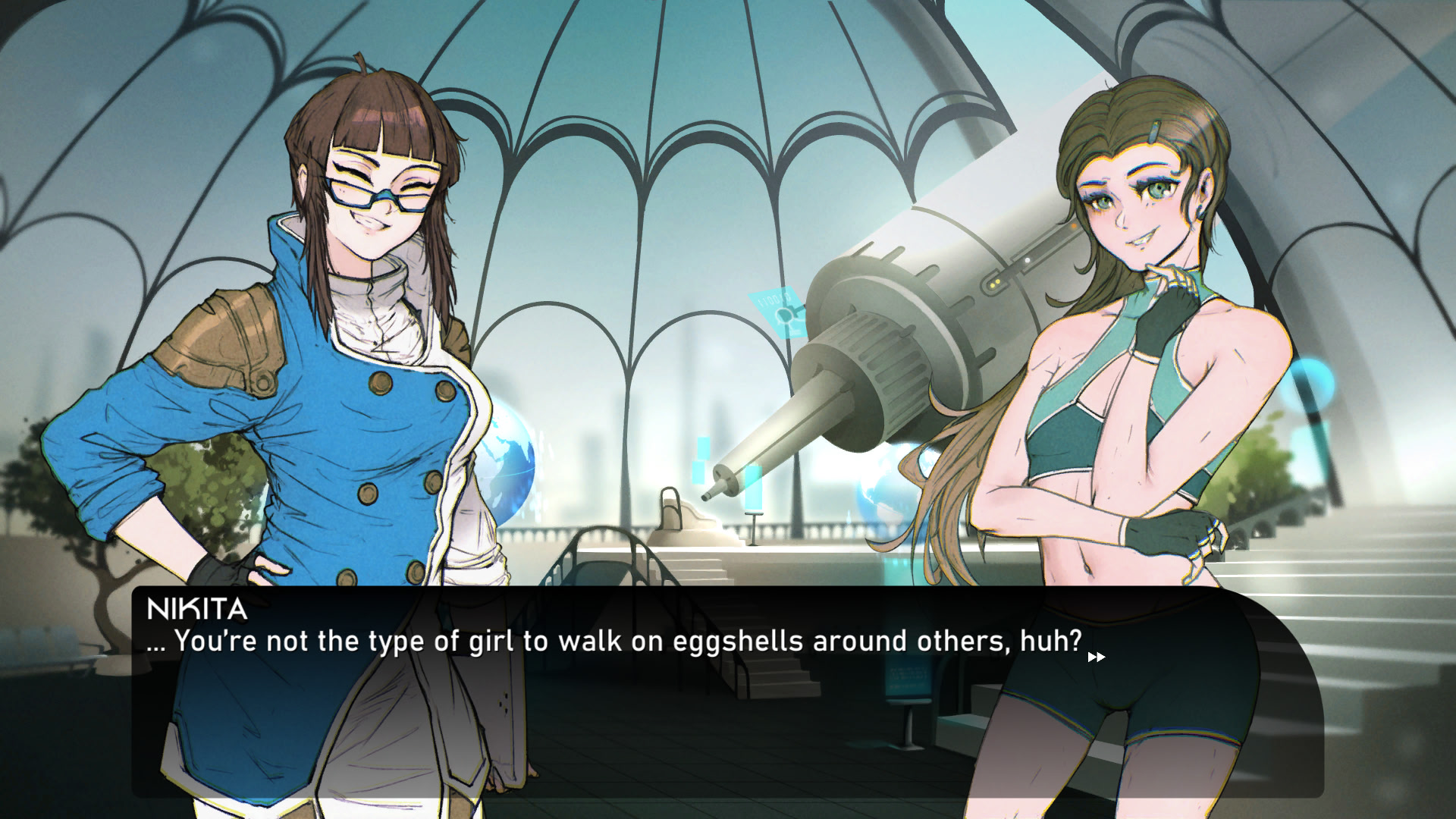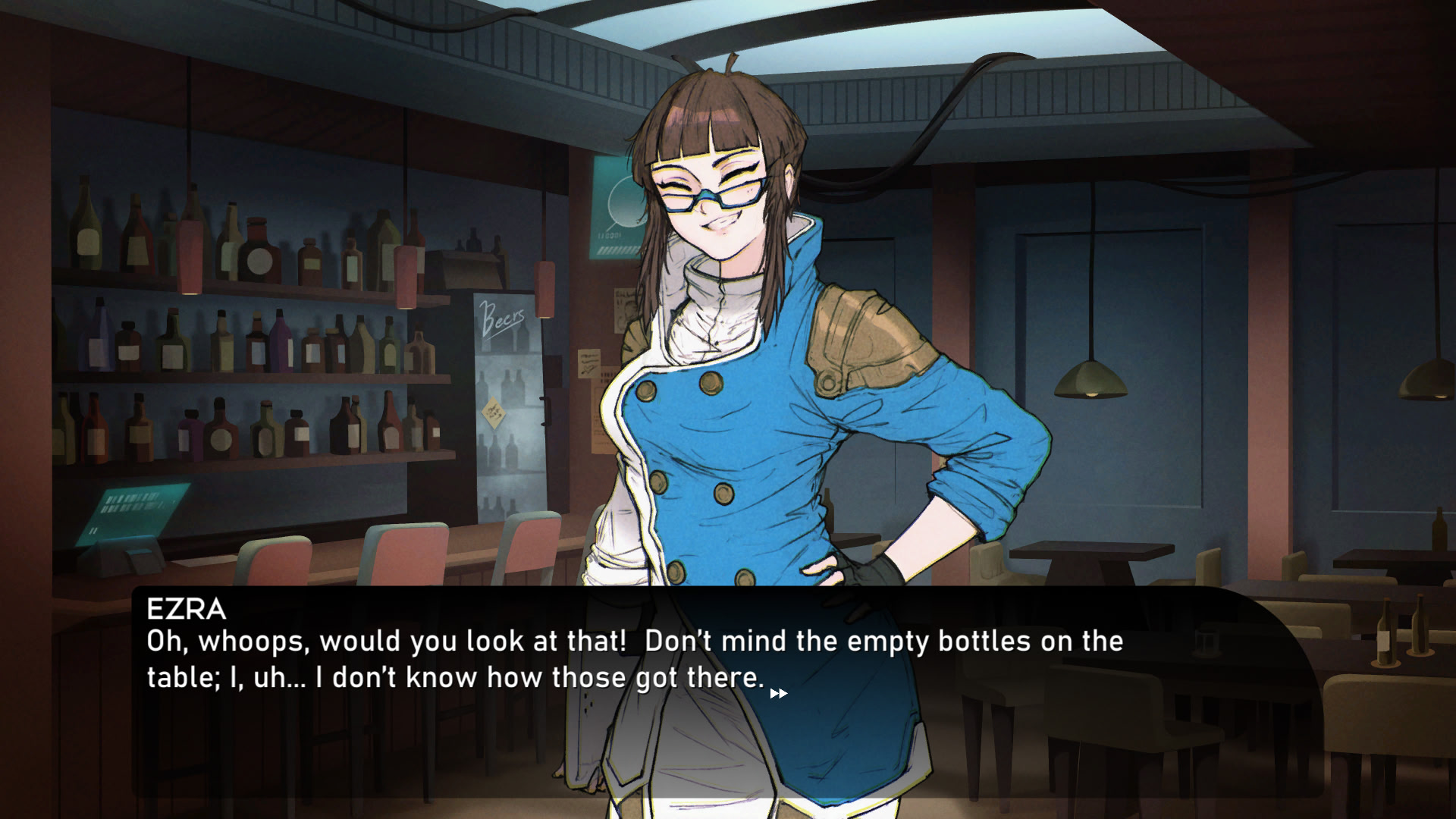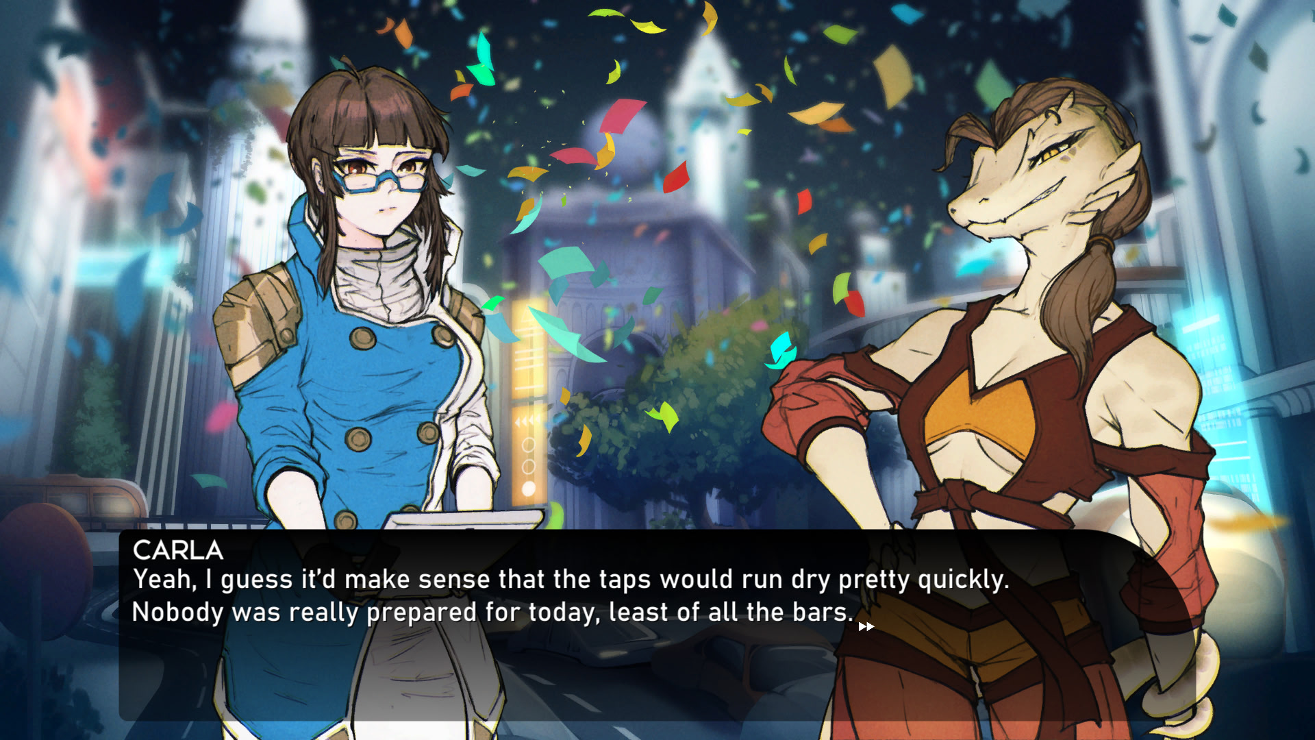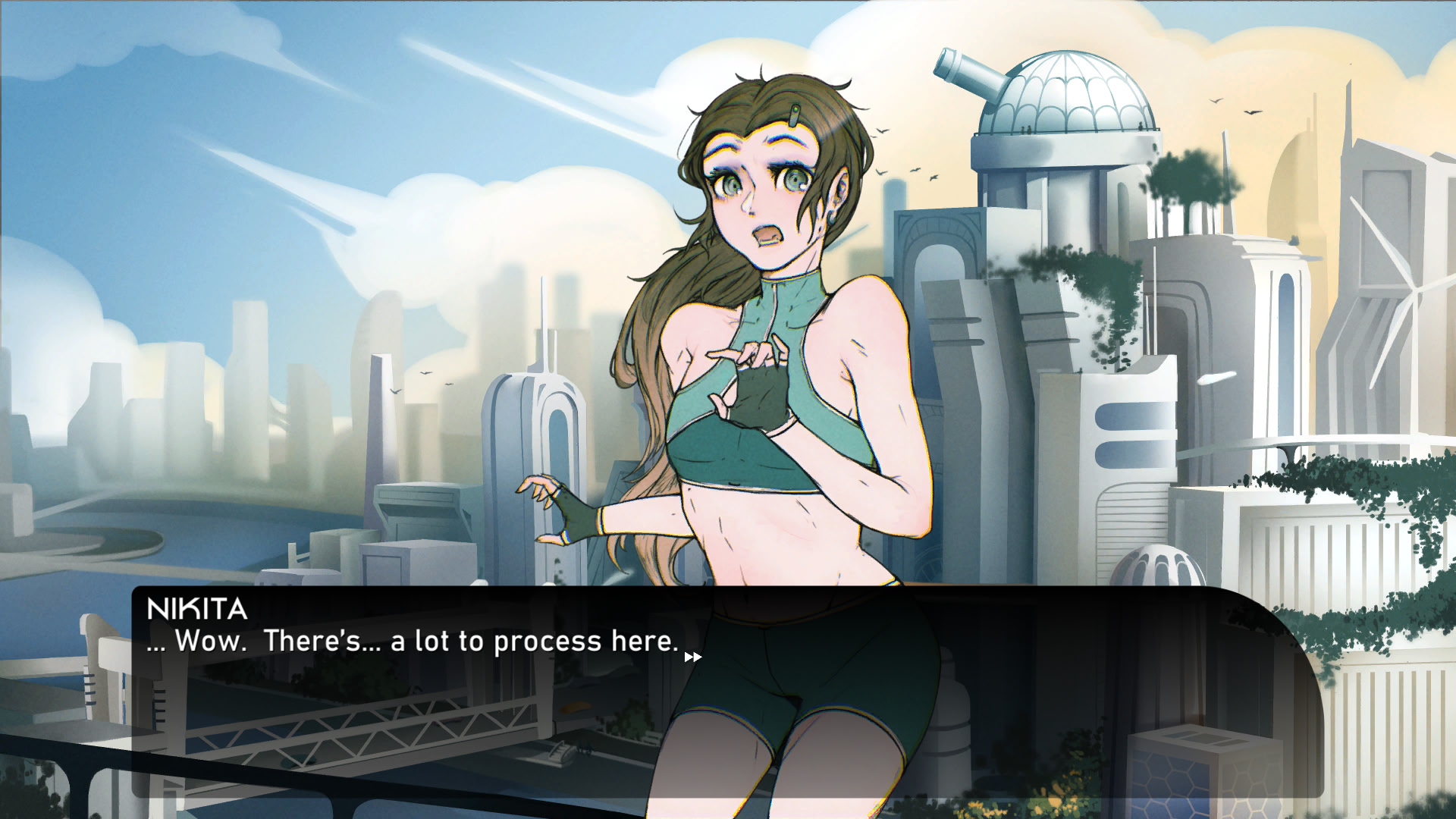 You play as Ezra Foy, a young twenty-something coming out of their senior year at university. For Ezra, it feels like time had stopped: the war effort was all anyone could focus on, and now that peace has finally been won again, the time for revelry and relationships has begun. Choose between three love interests, each with their own deep branching storylines and hundreds of lines of dialogue; enjoy a futuristic setting involving people and places of all different walks of life, including a friendly lizard-like alien species known as the Ghians; and decide what the best course of action should be living in a post-war era, and what we as individuals can do for our future.