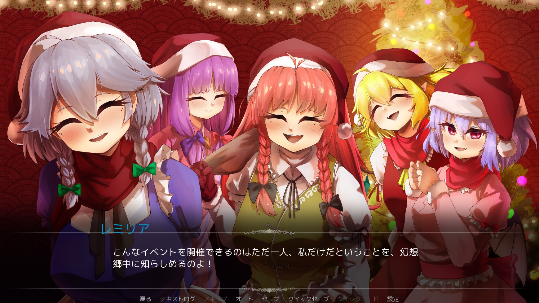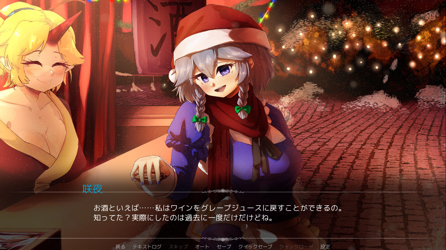 The Hakurei Shrine Maiden had this brilliant idea to host a Christmas themed festival in the human village, and it immediately caught on! All of the residents of Gensokyo, human or youkai are invited to celebrate Christmas and have fun in any way they can! You're out on a date with Sakuya and you're...