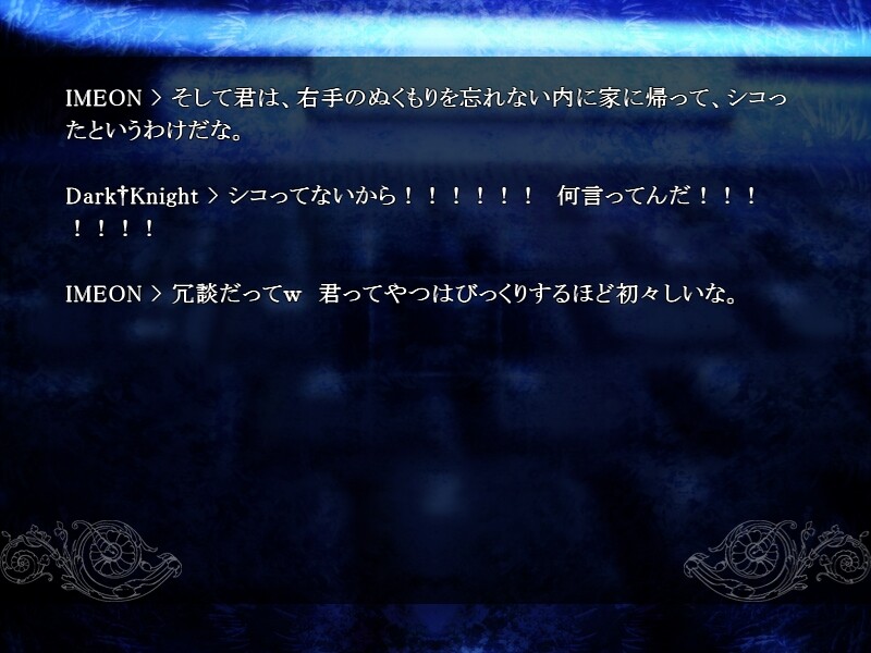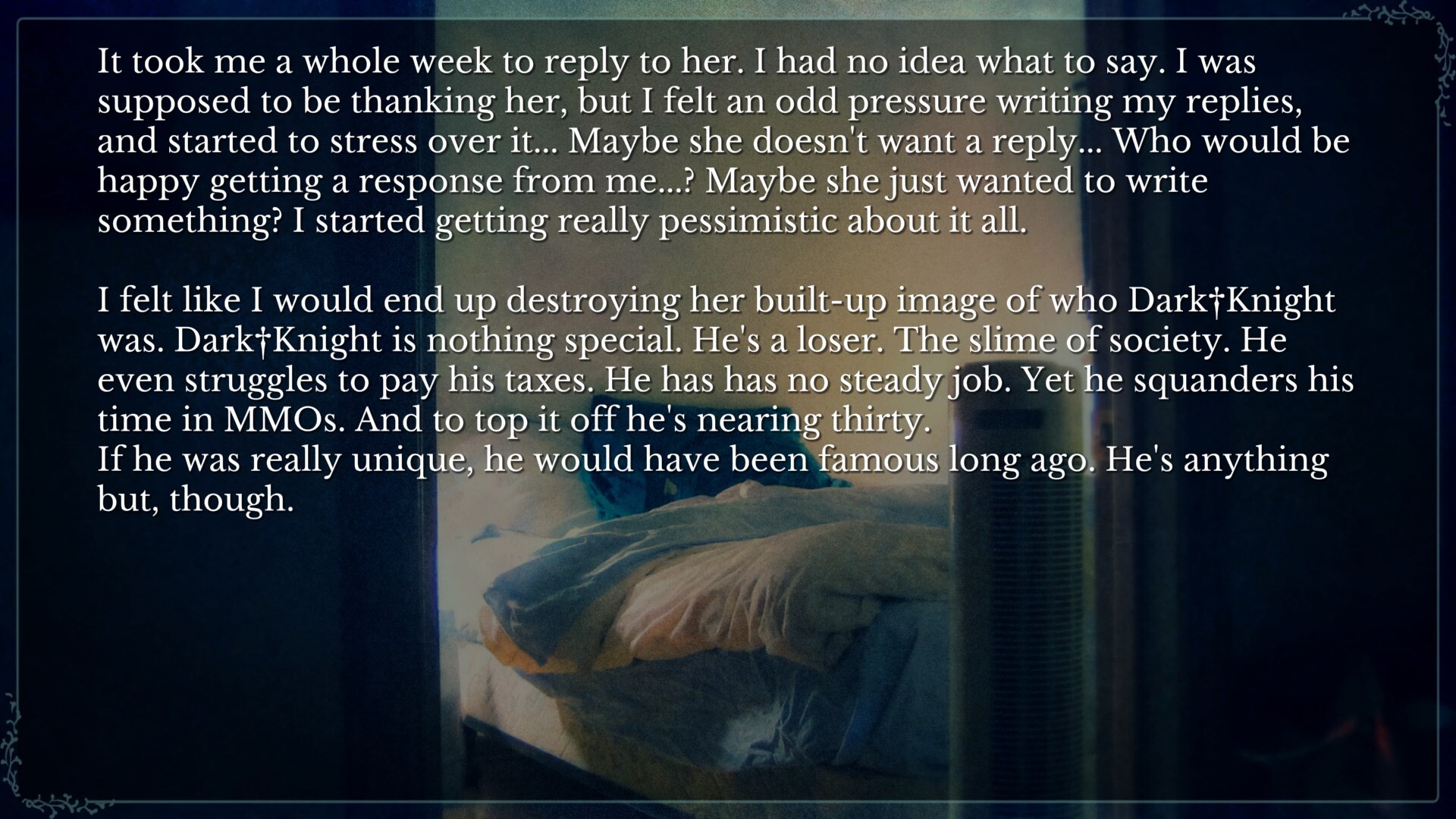 Dark†Knight, 27 years old, an indie game developer beginning to grow apprehensive about his lack of success. His life is on the bottom rung of society, and his career hangs on by a thread, but it's all about to take a positive turn when one of his very enthusiastic female fans reaches out.