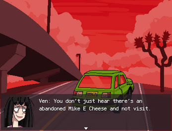 The sky is the wrong colour. Go on a road trip with your weird friend to explore an abandoned pizza joint.