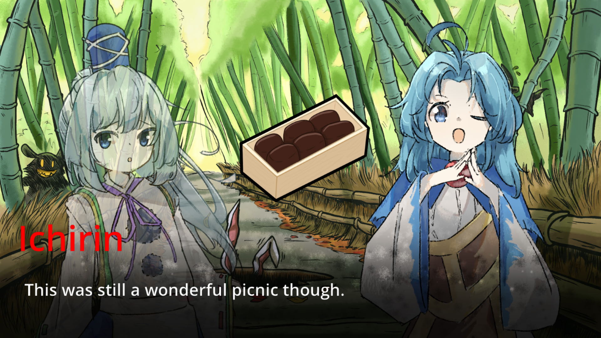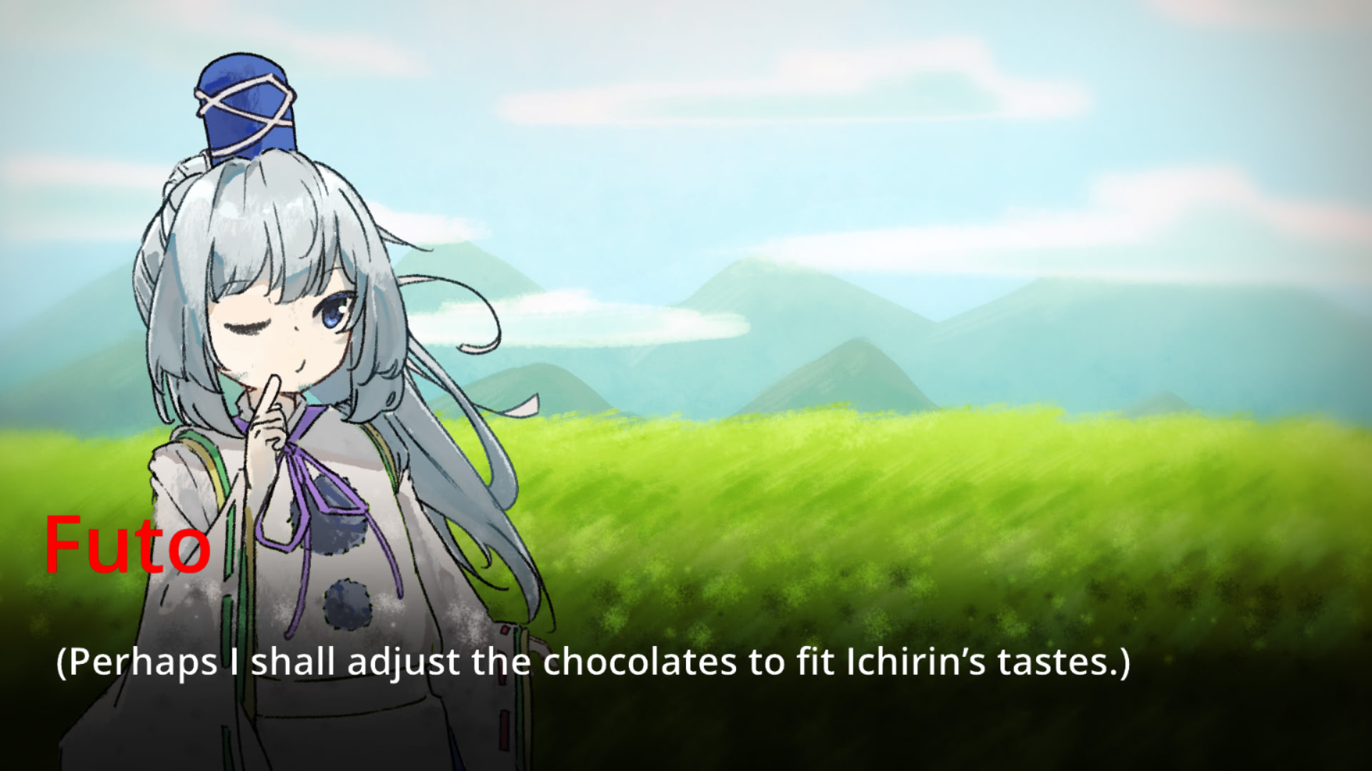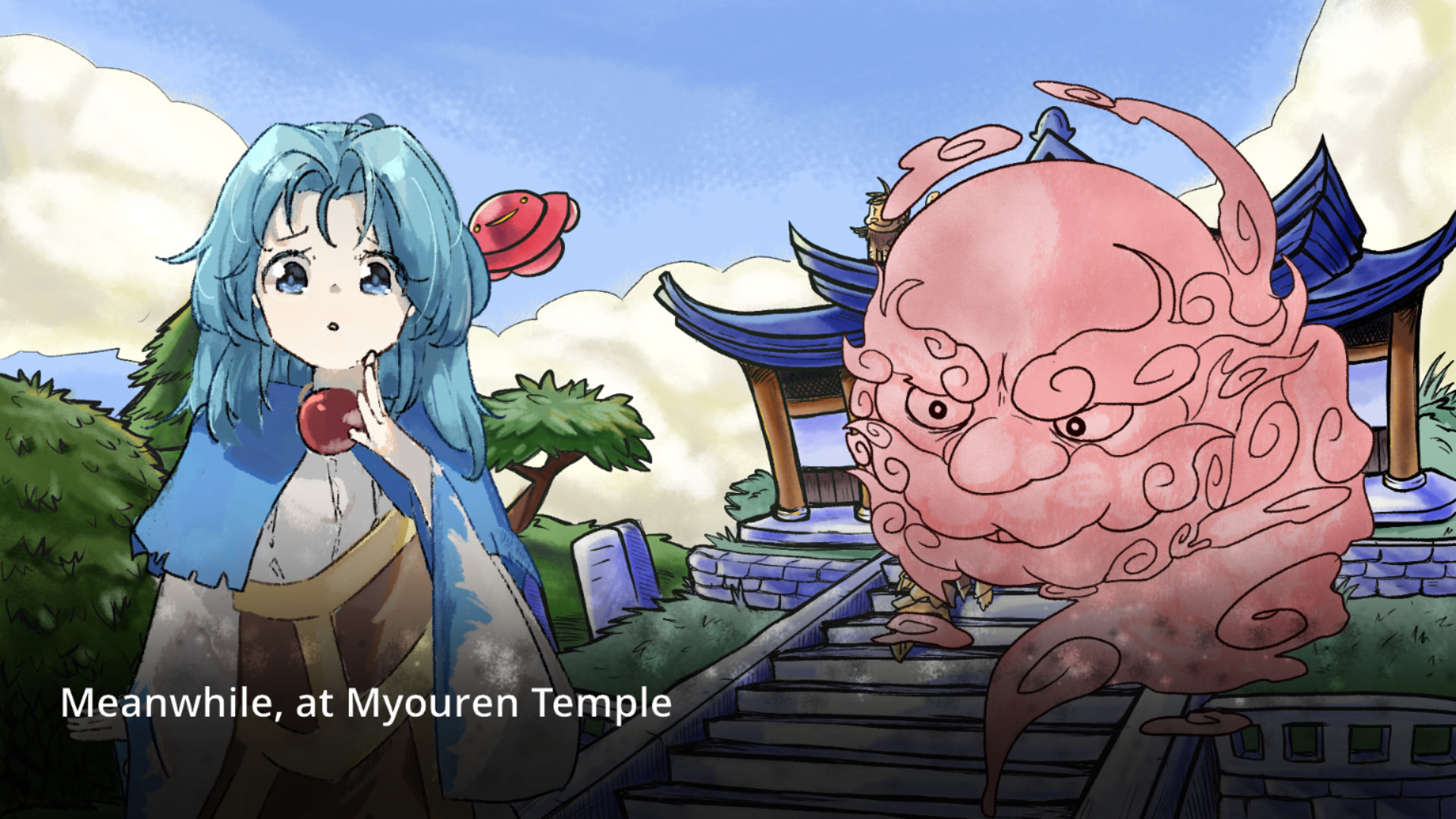 A Romantic Sitcom in Gensokyo starring a Chaotic Couple! In this Visual Novel with Minigames, join Ichirin and Futo on their romantic misadventures, featuring kooky costumes, exciting card games, a giant floating cloud, and more! Itch.io]