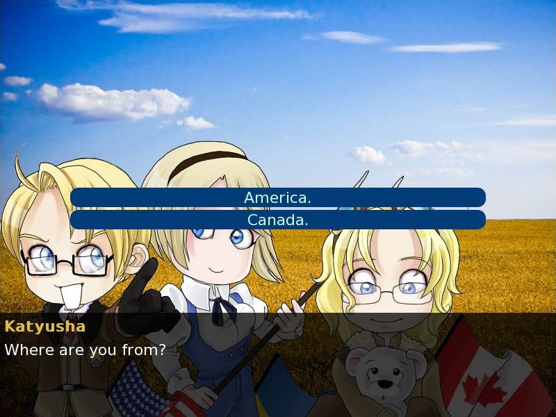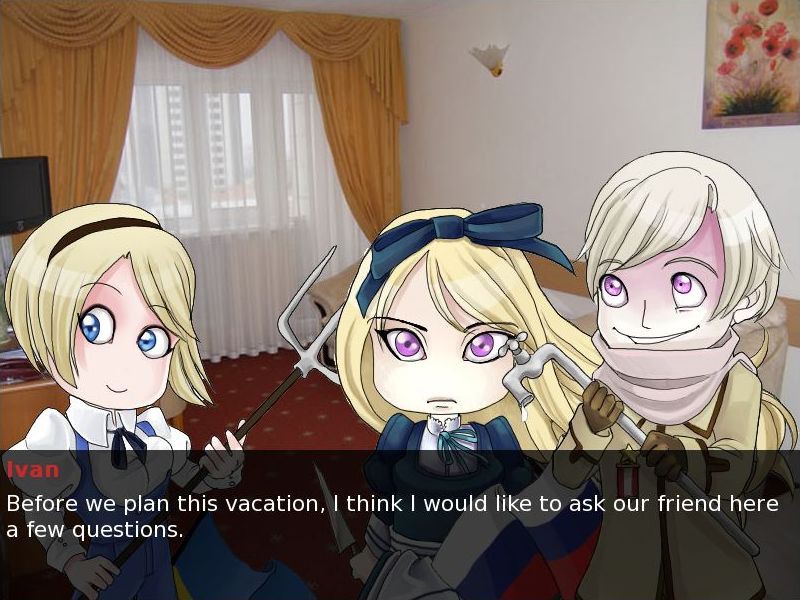 A short Hetalia-inspired dating simulator, focused on the character of Ukraine. Includes interactions with her little sister Belarus and her little brother Russia.