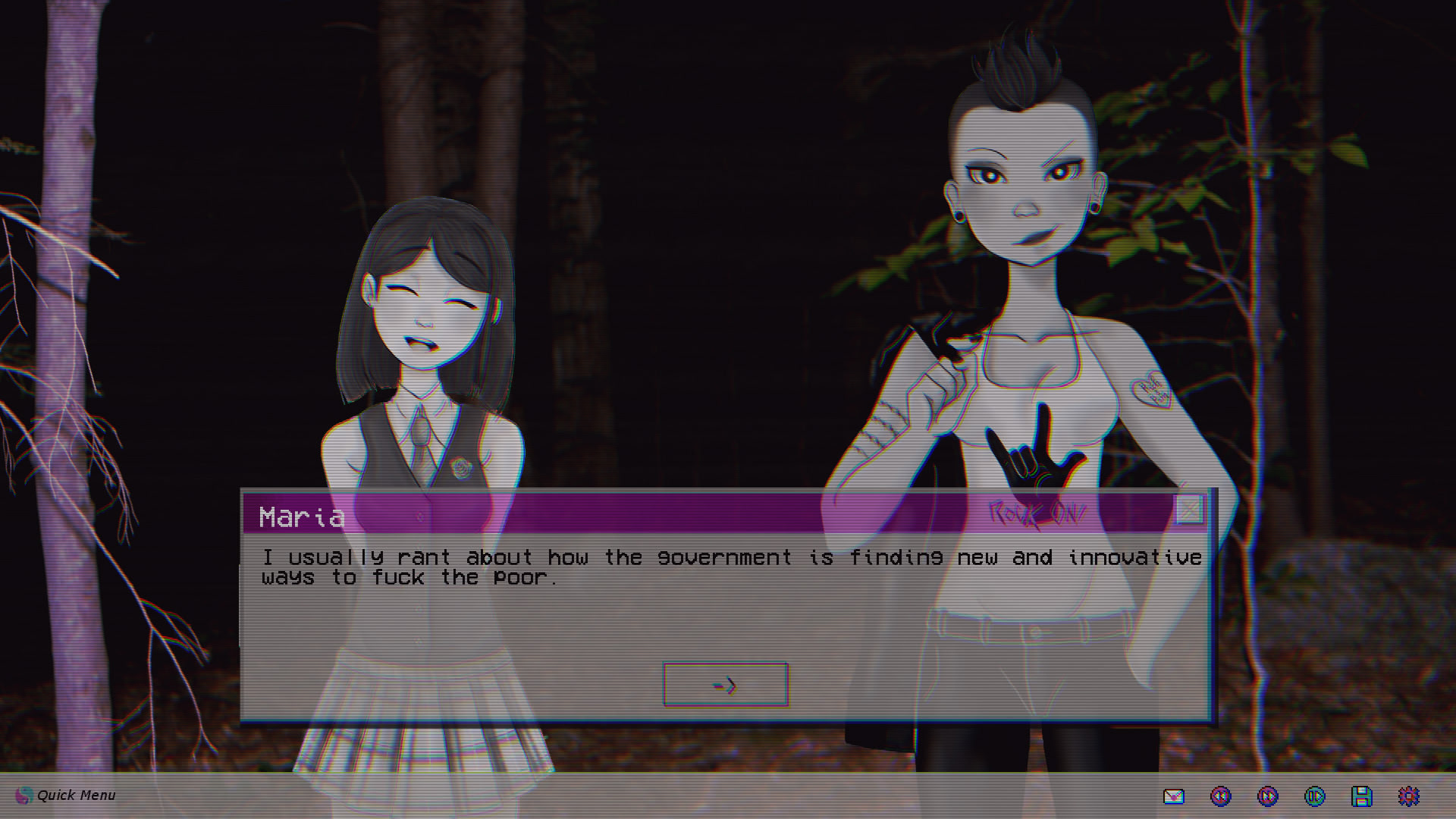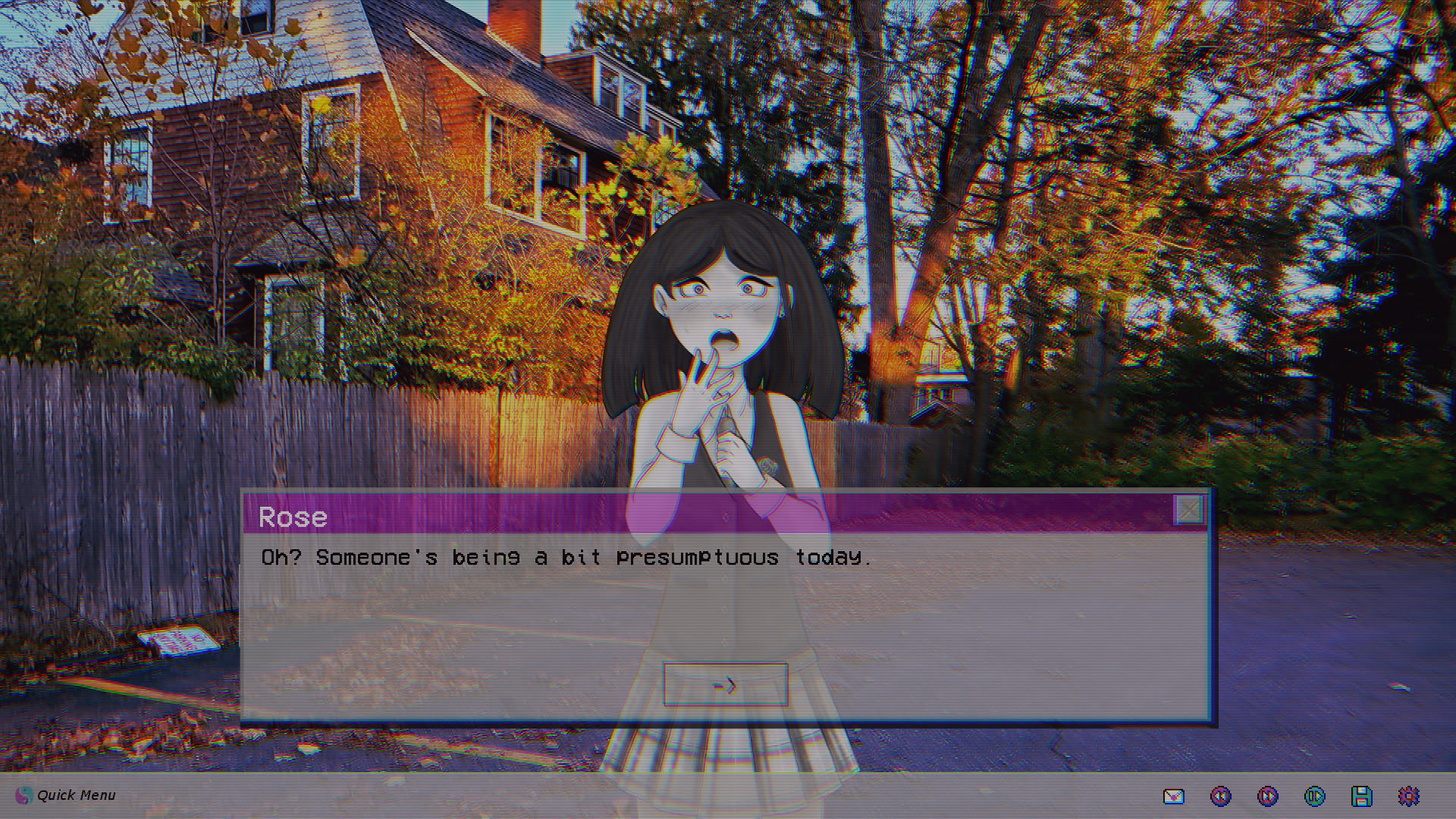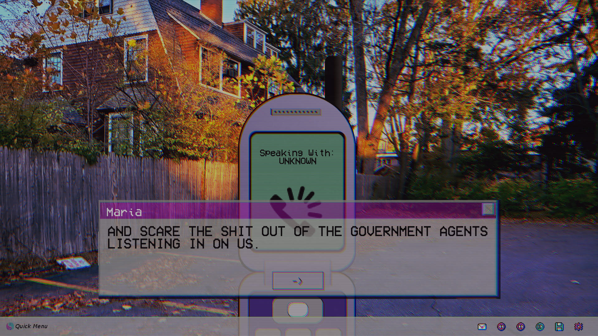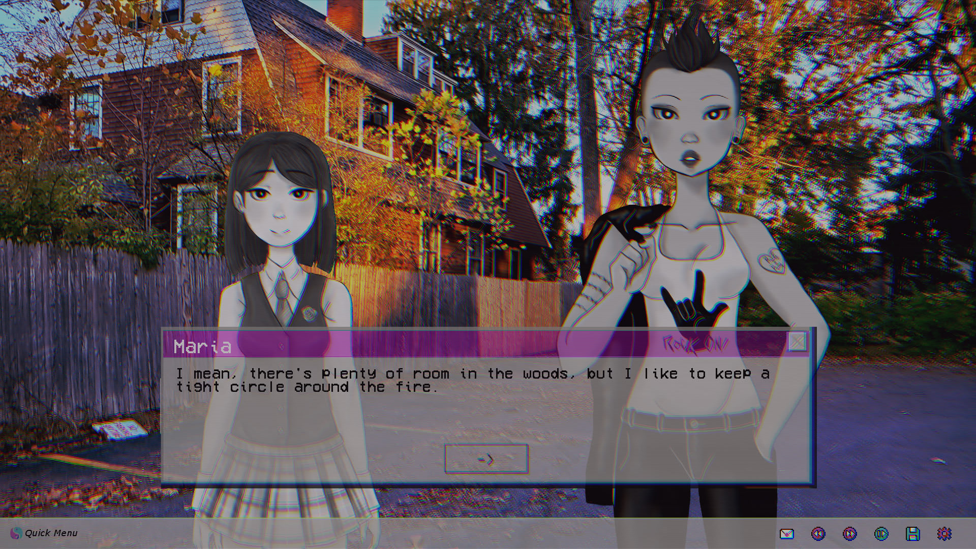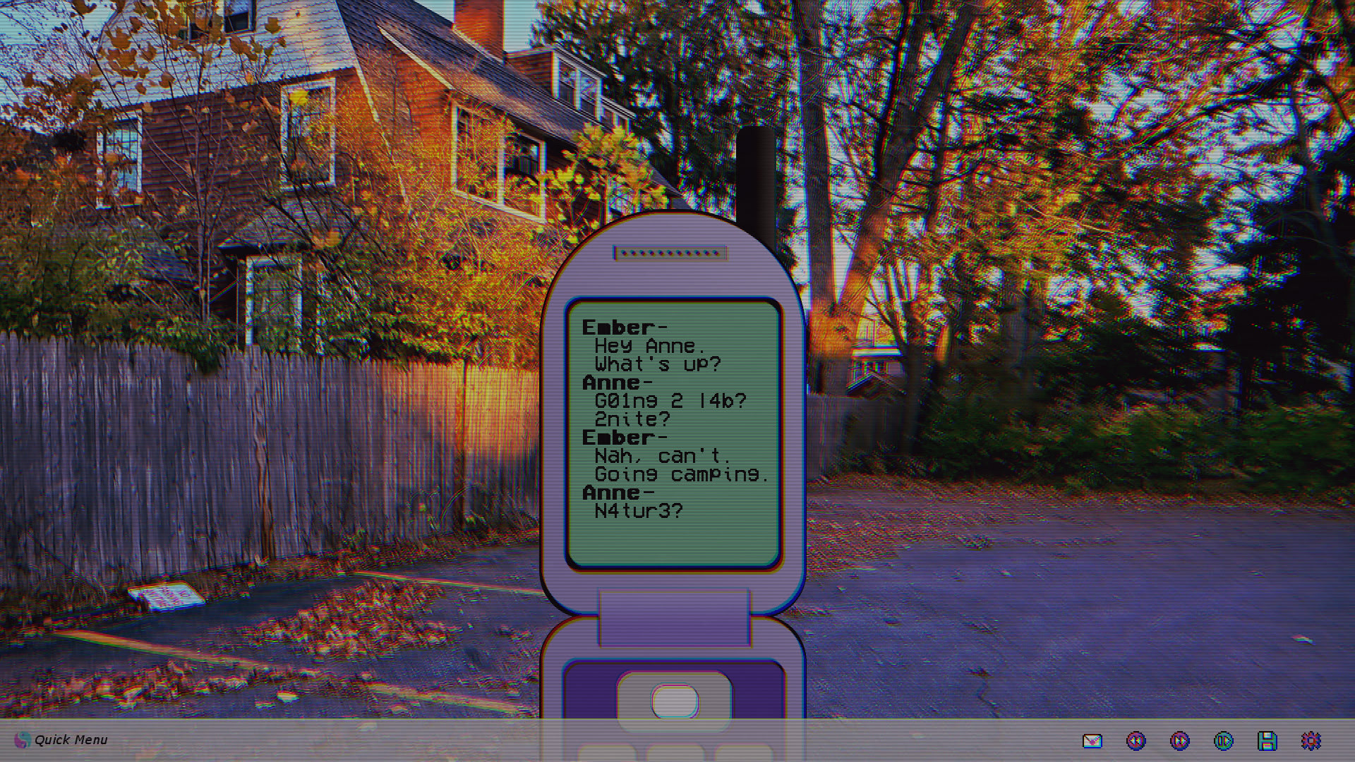 You're a college freshman with college freshman problems: you've got an awful professor, your roommate's kind of a flake, and this week really just hasn't been going your way. Luckily, you've got just the thing planned for this weekend: a night in the woods with the girl you've been (sorta?) seeing and your new (sorta?) friends. But things are never that easy. As you receive strange phone calls and hear concerning noises from beyond the treeline, tensions arise in your small camp, and choices must be made that will determine your fate... or, at least, the fate of your relationships with your friends.