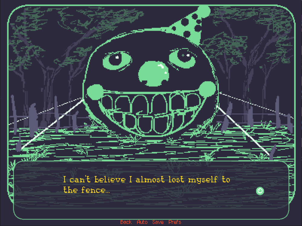 The fence, the trailer, the clowns. Will you be able to survive? Some say the grass is greener on the other side, but what is lurking over the fence, is up to you to find out or die trying. A quirky, silly and absurd story of someone trying to find meaning in this strange world. Itch.io]