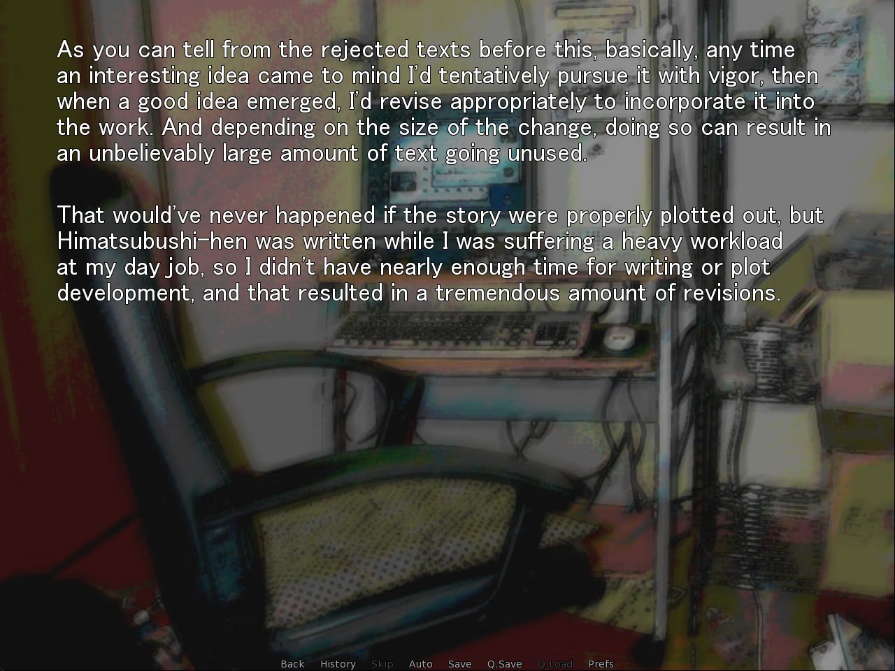 Contains a collection of short scenes written during the creation of Higurashi but ultimately discarded during the writing process, along with author commentary and illustrations courtesy of the Higurashi manga artists.