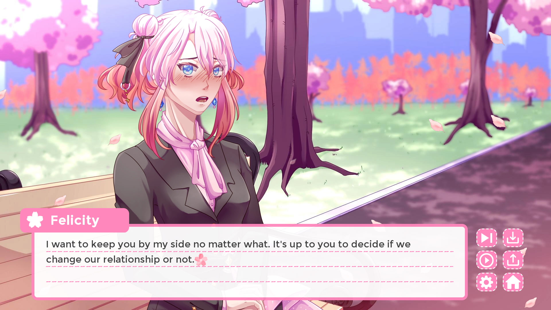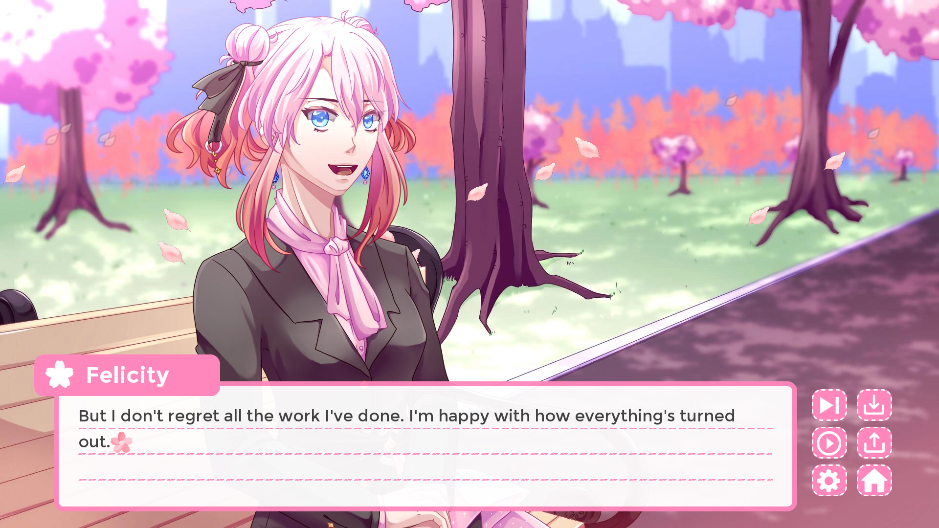 Felicity is the CEO of the biggest tech conglomerate in the country. After the news of her husband's disappearance breaks, she tells you that you need to talk. Felicity then reveals everything she's been holding in. And for the first time, she can be herself. Itch.io]