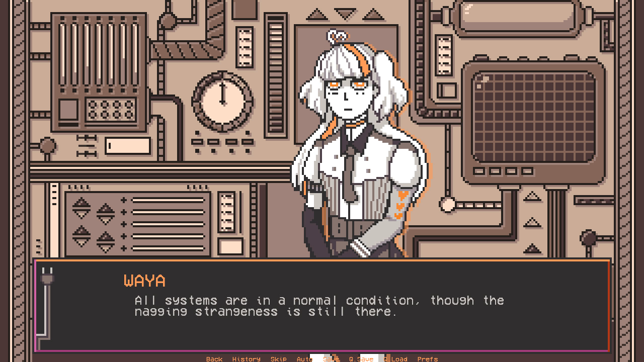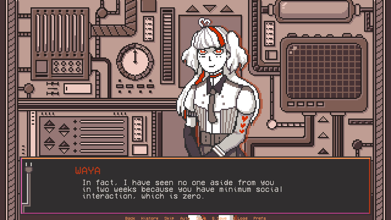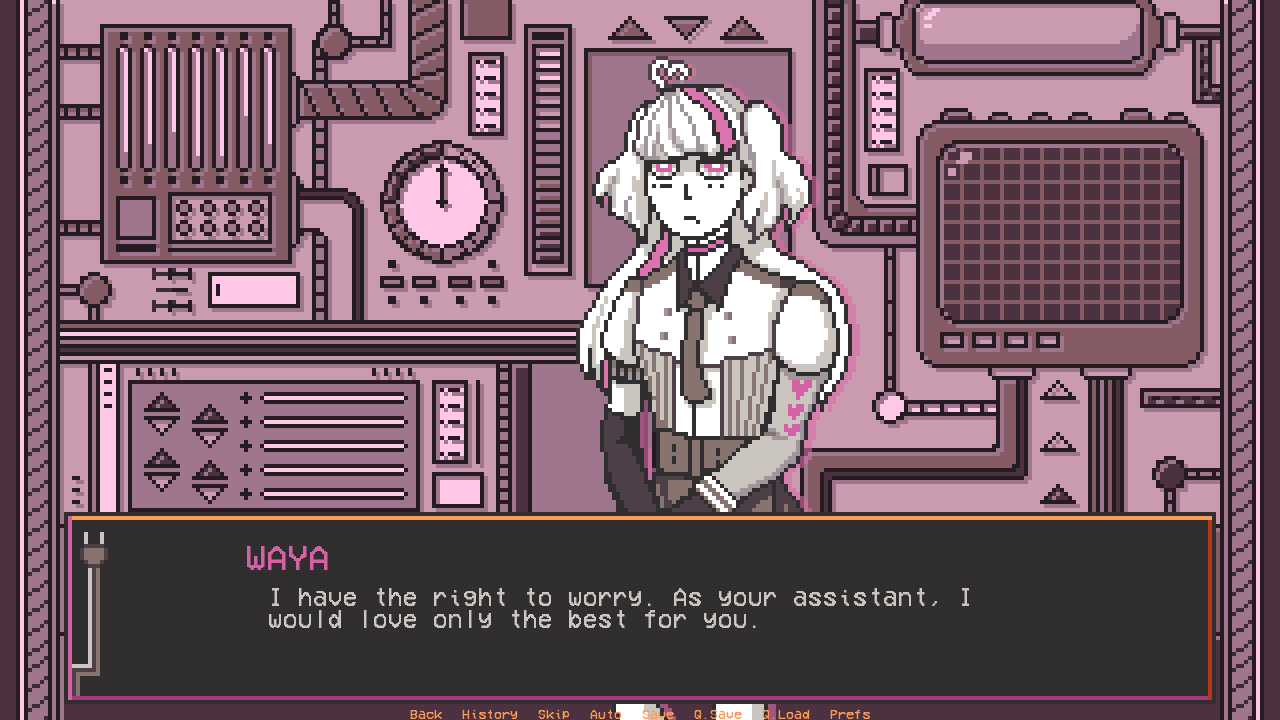WAYA is a short visual novel created for O2A2 2023 Queer Edition in which you play as a lonesome scientist who lives with her robot assistant and try to diagnose whatever's bugging her.