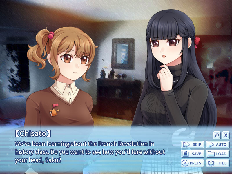 Saku’s determined to eat a lot of Mrs Shima’s delicious cooking, play a lot of fun otome games on Chisato’s cutting edge PC, and generally have a blast.