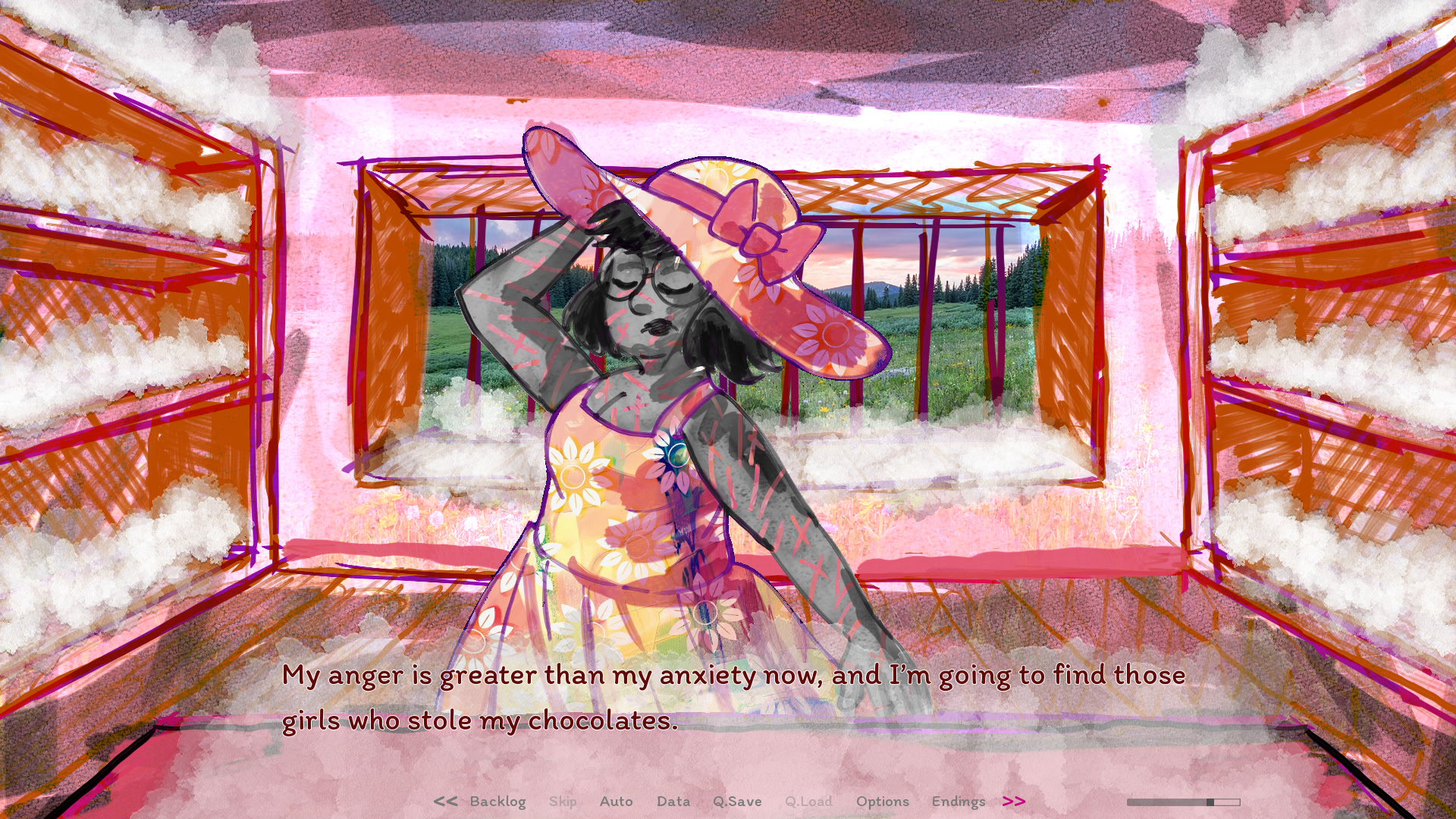 A very short visual novel about a lonely, bitter woman running a dusty shop meeting the most beautiful women she's ever met, who are also taking her beloved chocolates.