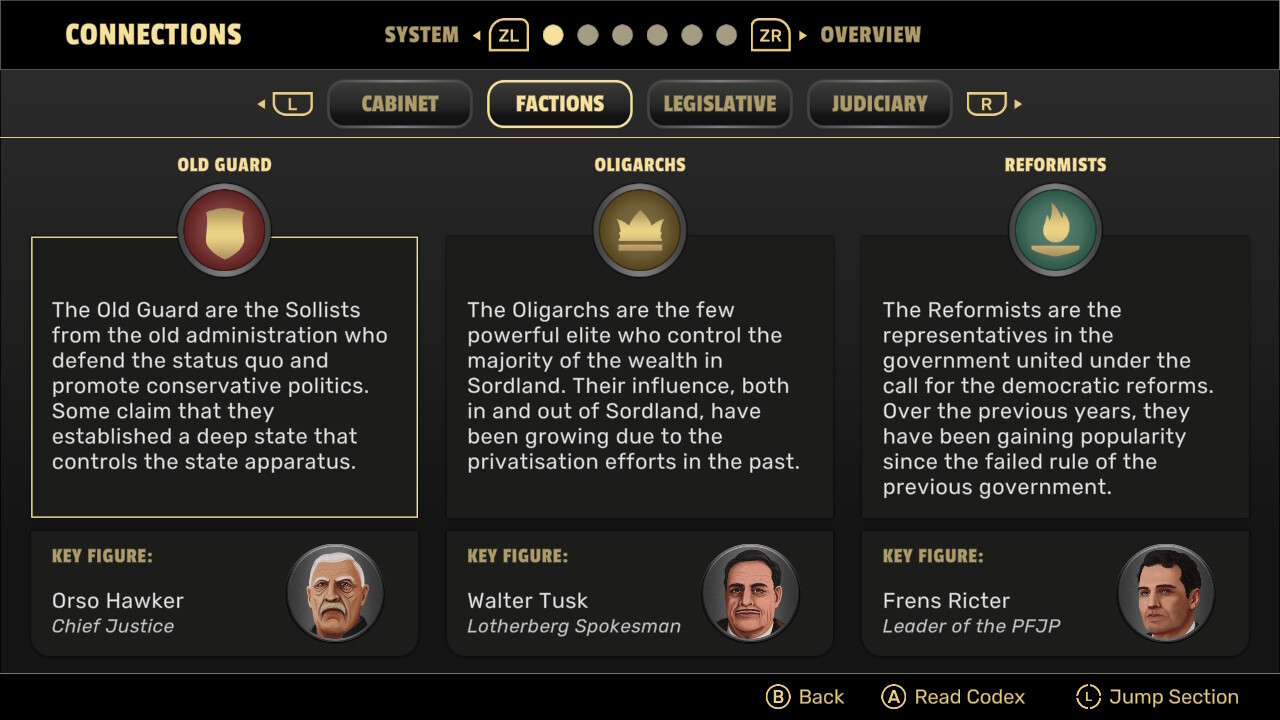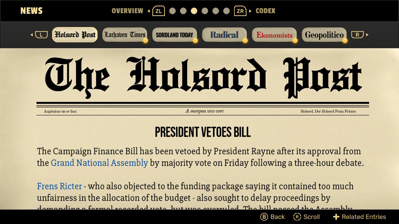 As President Anton Rayne, lead Sordland during your first term of this text-based narrative RPG. Navigate a political drama, driven by conversations with your cabinet members and other significant figures in a country with its own complicated history. With looming border conflicts, entrenched corruption, economic crisis and people desperate for reform, as leader the difficult choices fall on your shoulders as you strive to uphold your election promises.