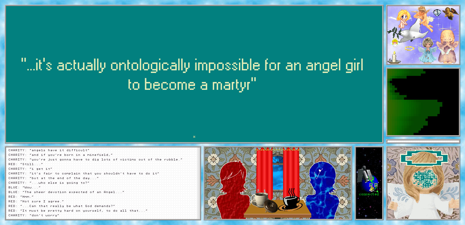 The fall semester at UofX, 2003. Two graduate students gather to speak with an angel girl. Meanwhile, the ties that bind three women tighten and twist. Only files remain. Trace your fingers around the circle carefully. itch.io]