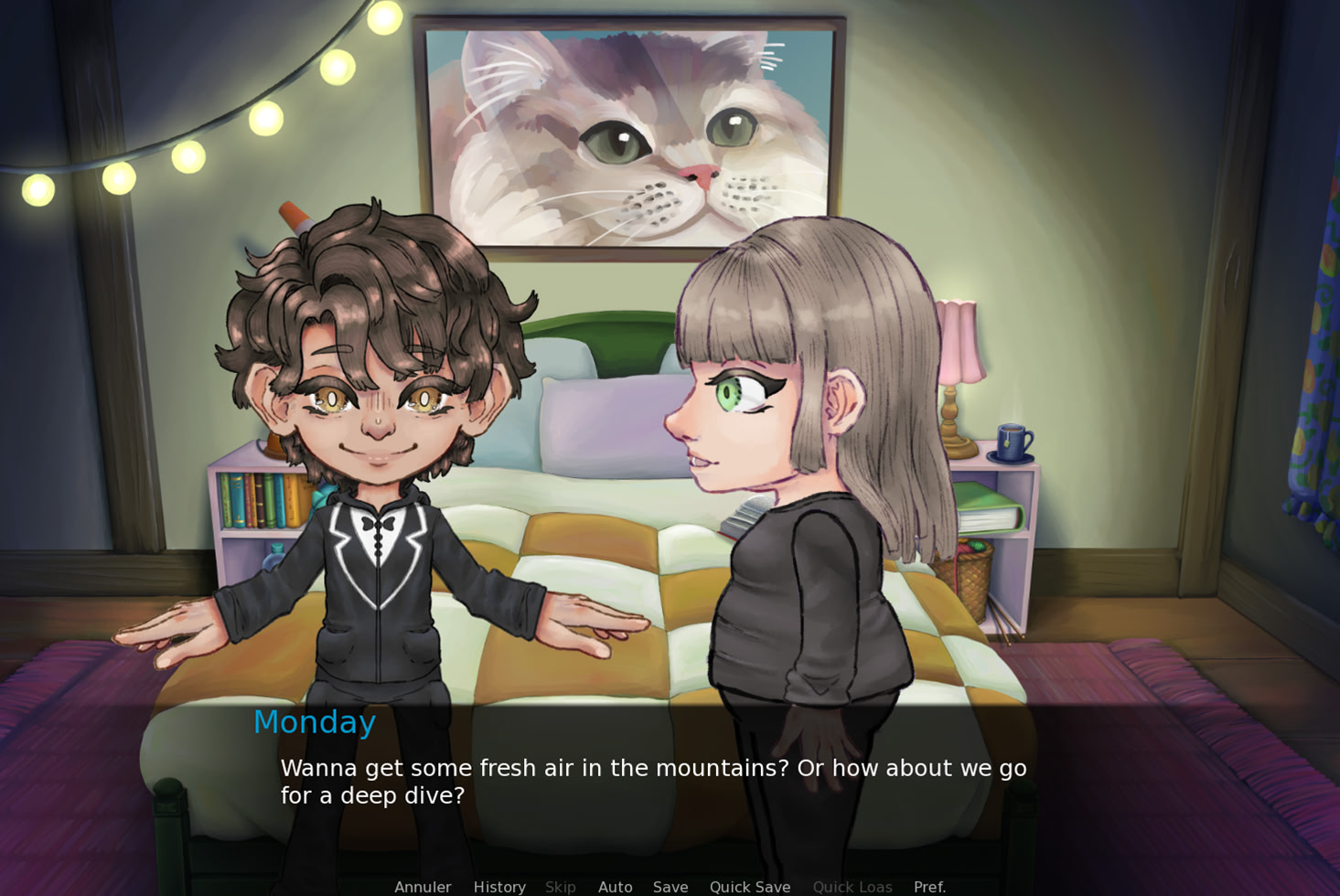 Sex is boring, adventuring is fun! Join Monday and Corduroy in their ace-tastic nightly adventures and discover a new world filled with surprises. A short but funny looping game with four possible adventures, and a bonus scene if you finish all four! Itch.io]