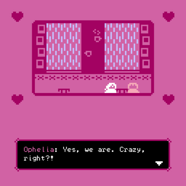 This tiny bitsy game / visual novel tells the story of Lydia and Ophelia - two lesbians that experience their first date in person, after they have been talking online for a while. The scene takes place in a tiny café, on a rainy day. Both characters are adults and above the age of 21. Itch.io]