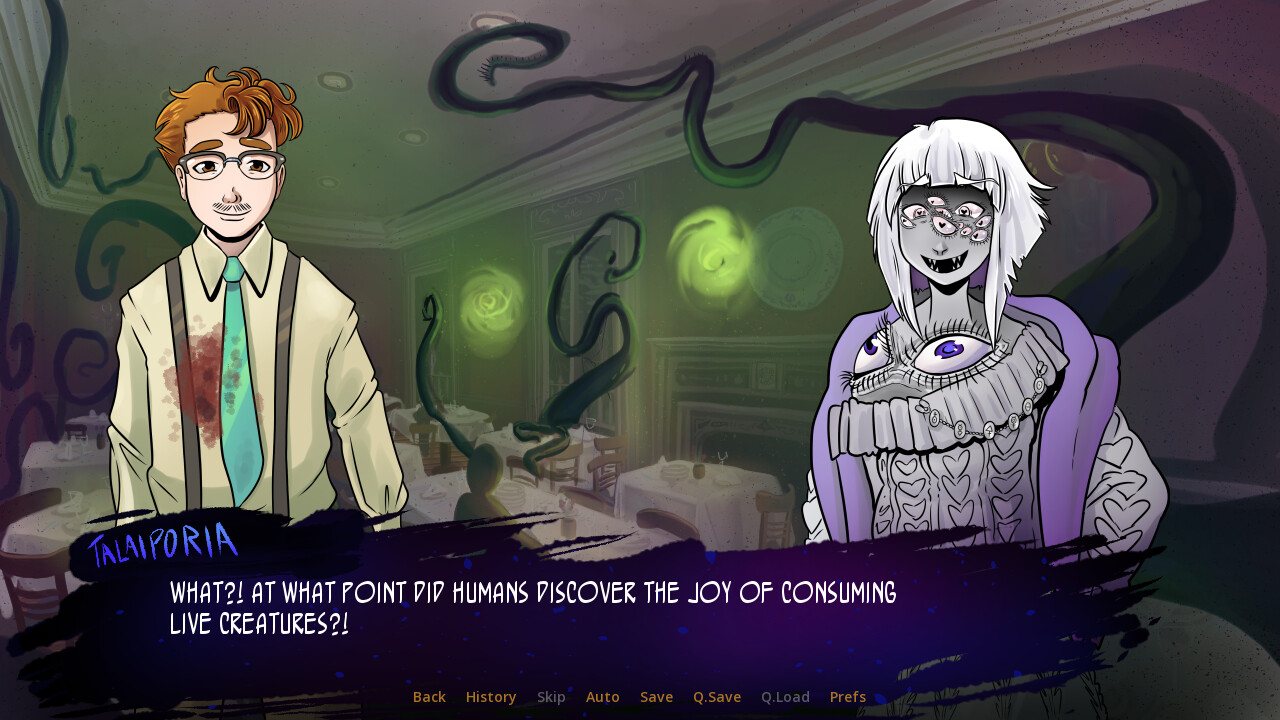Tonight, we're pleased to serve you a fun little romantic dish with a scoop of horror and a nice, bloody ganache. May I Take Your Order is a short visual novel about a half hour long with five endings. You play as a waiter serving a couple with...strange tastes. Itch.io]