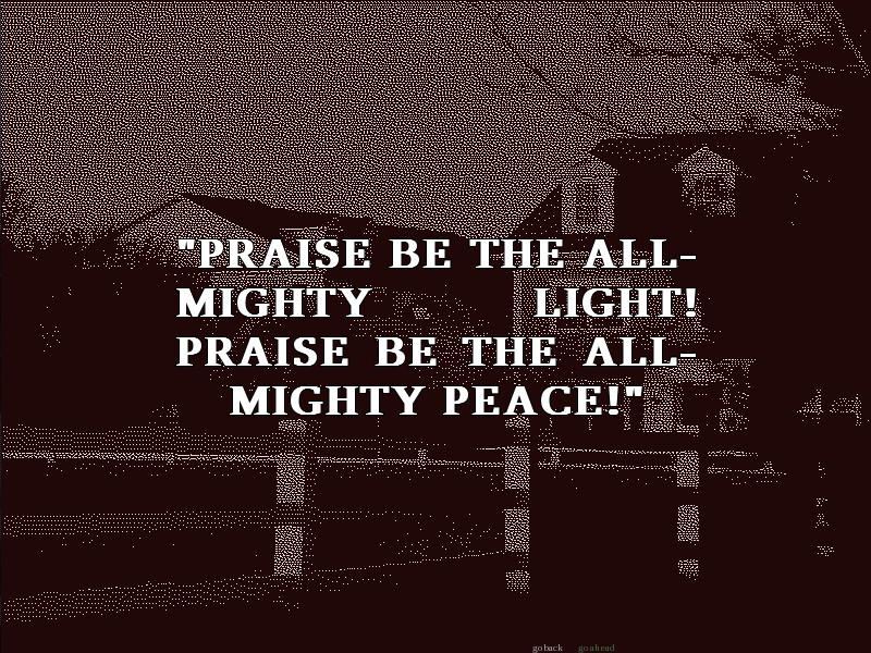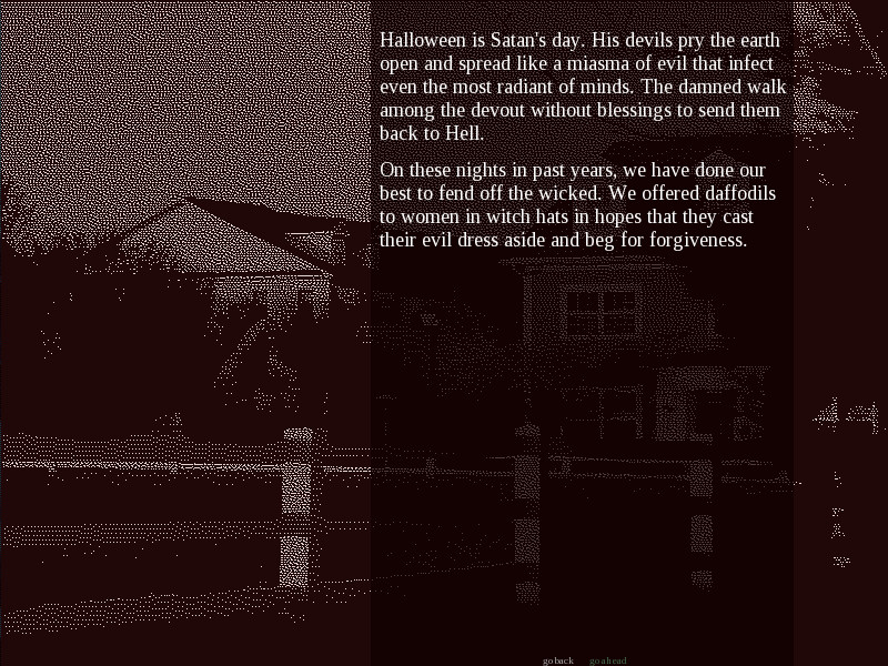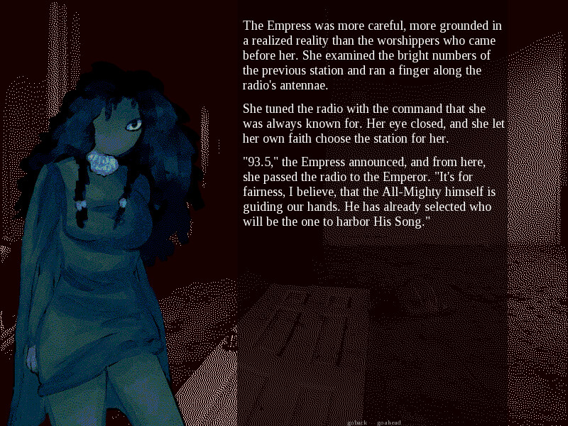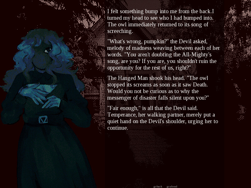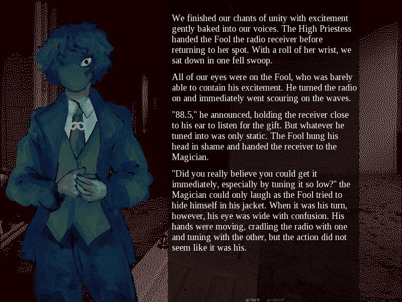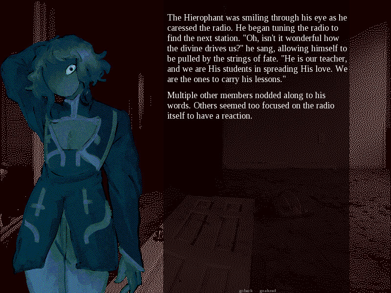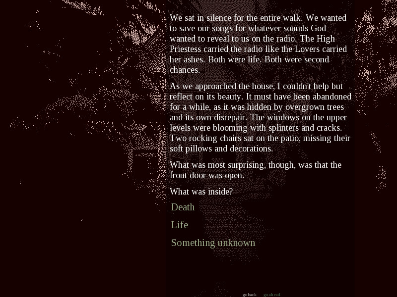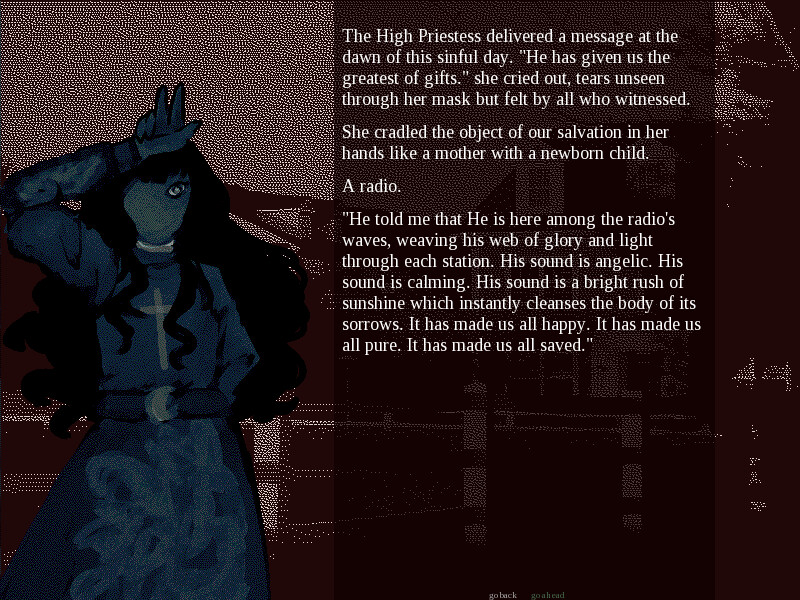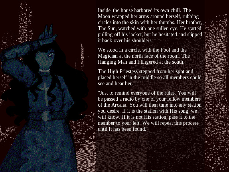 You're The Death, one of 22 members of the Major Arcana, a cult dedicated to some far-off god. The night is Halloween, and you watch in scorn as the unknowing dance among devils and dress to indulge in sin. The High Priestess receives a message from the all-mighty himself: The Arcana must gather in an abandoned house and find his song on an old radio receiver. By finding his gift, he will grant you the life, eternal, and the world will finally be able to hear his light.
