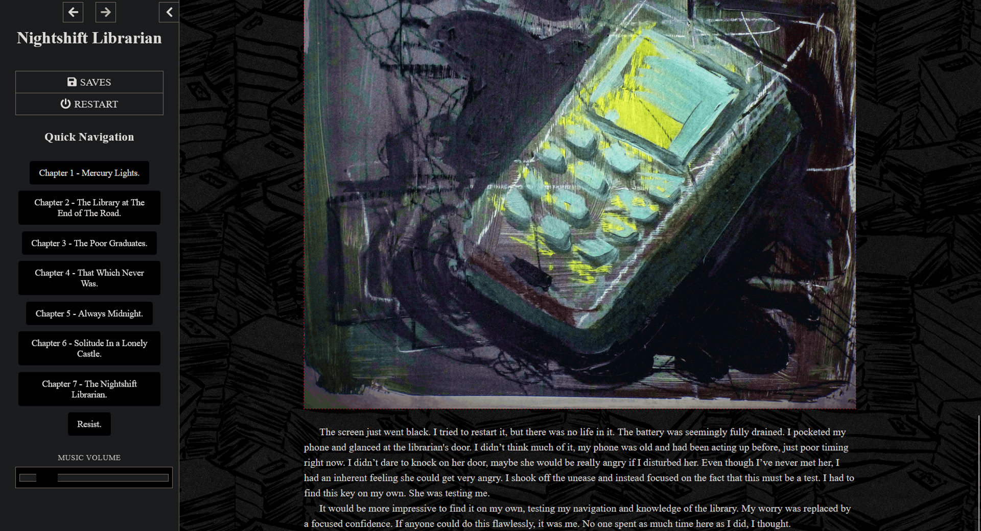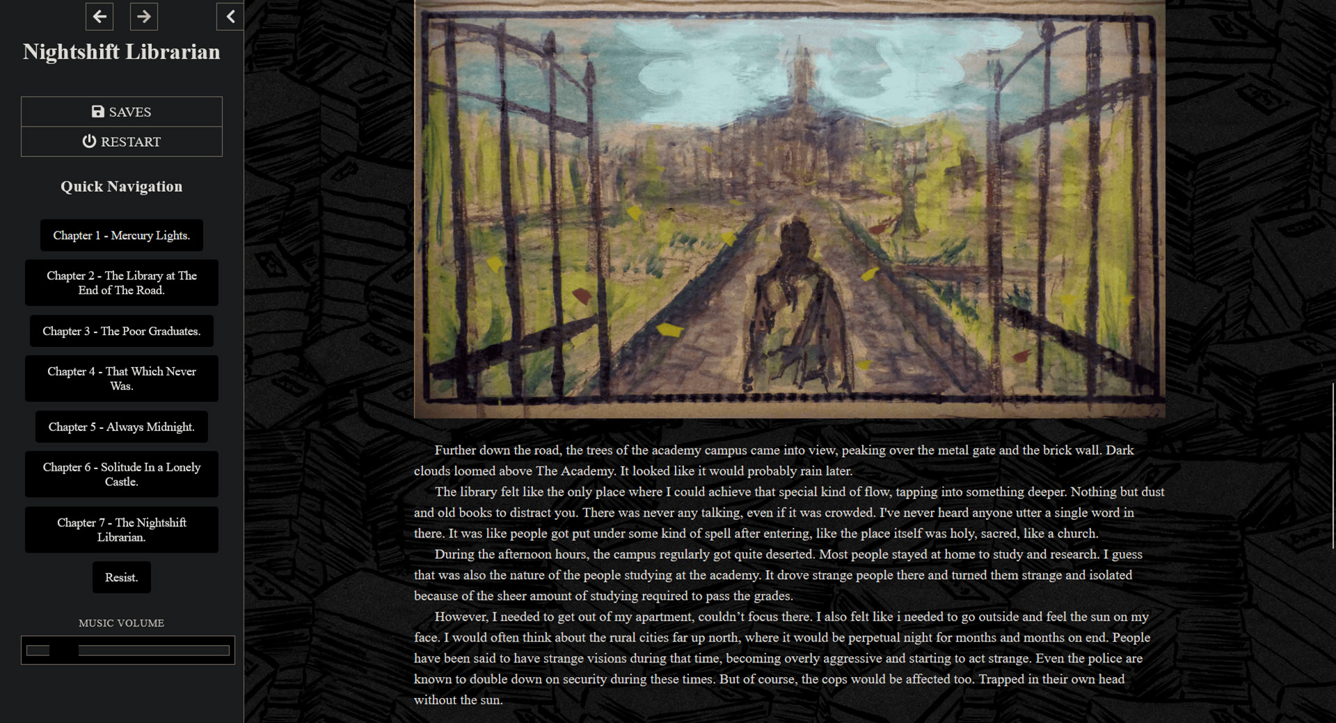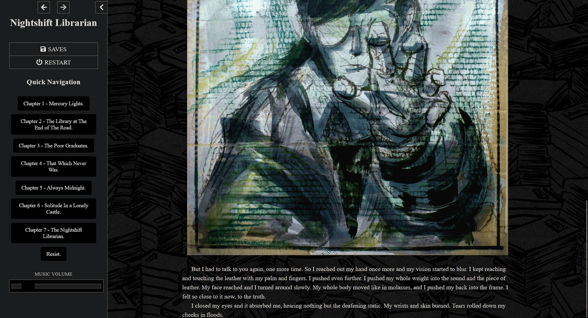 The Academy’s library isn’t supposed to be open at night. But when Ash takes a job as its night librarian, the quiet becomes something else – a whisper behind every shelf, a feeling that the walls remembered. Itch.io]