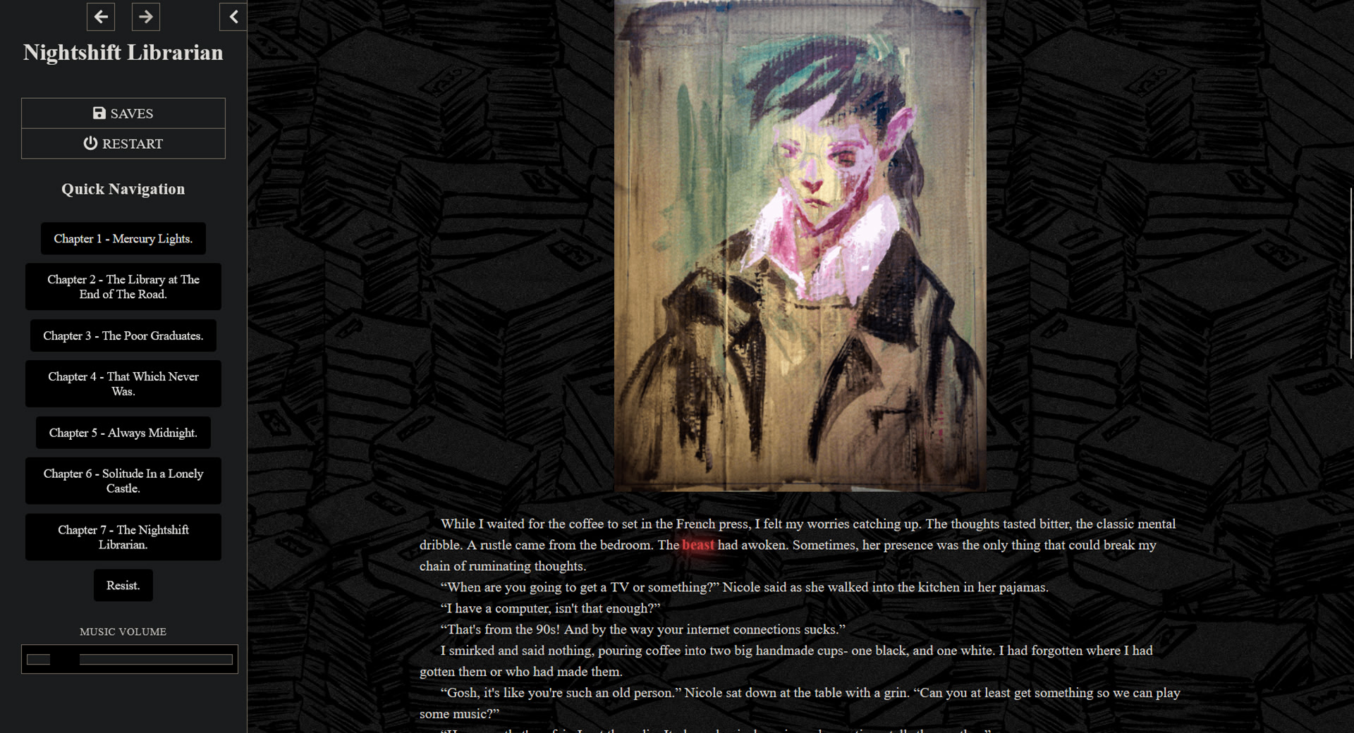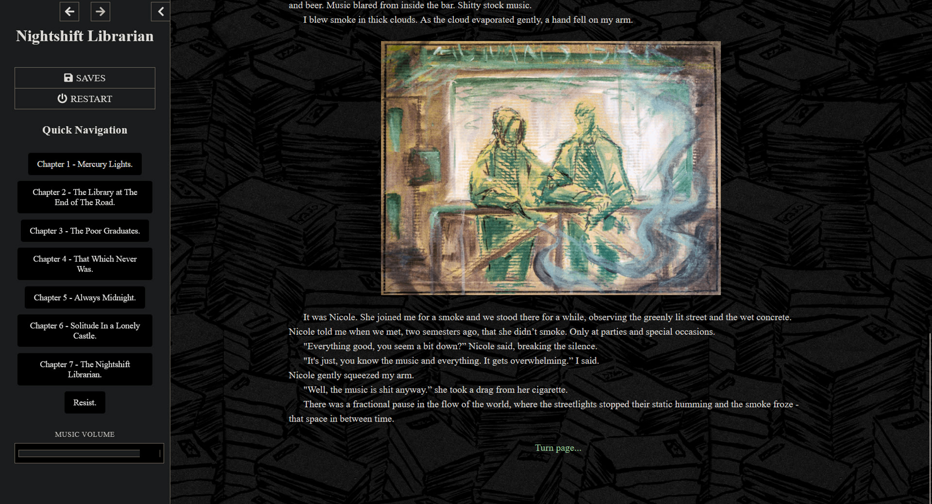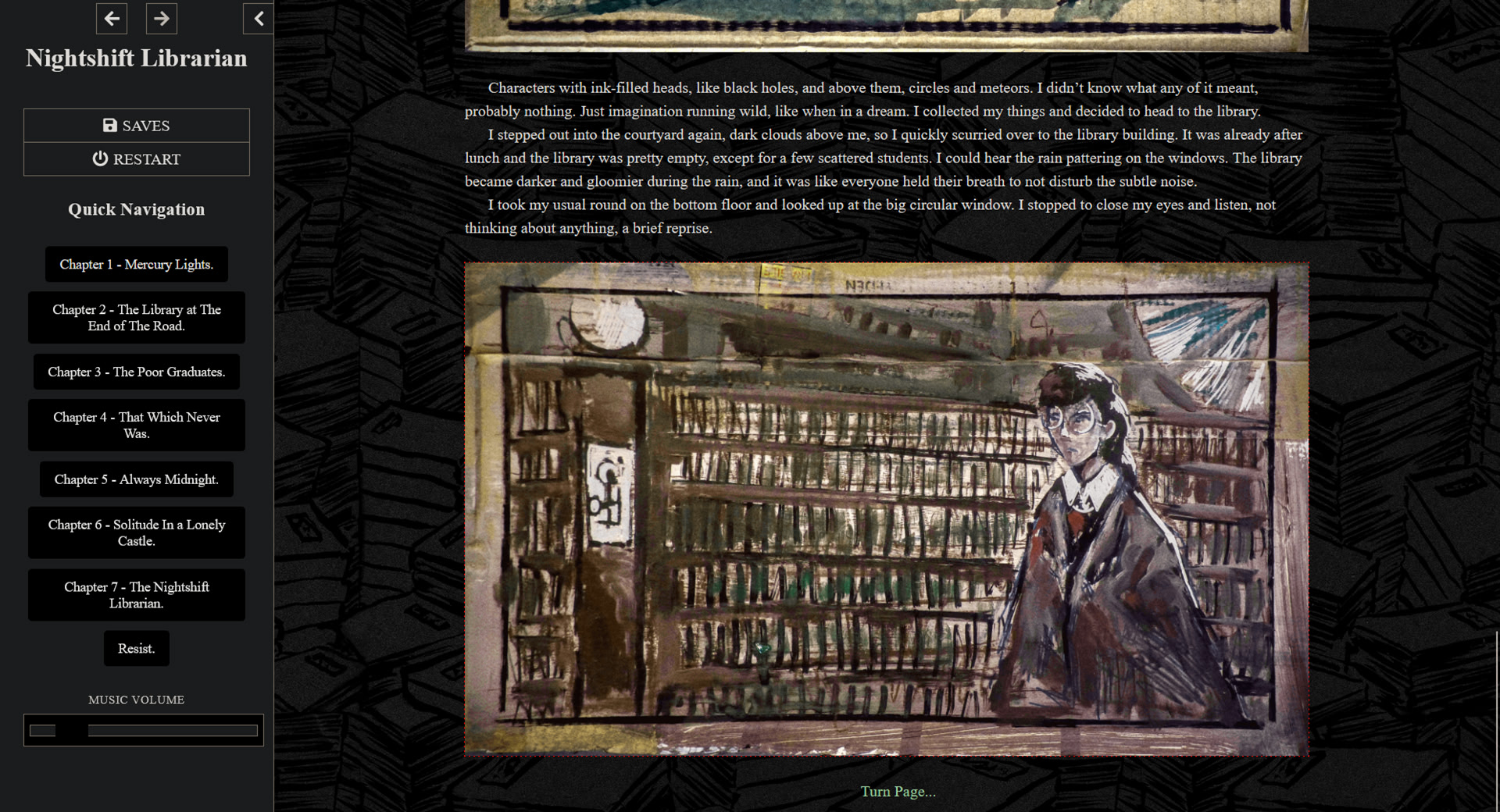 The Academy’s library isn’t supposed to be open at night. But when Ash takes a job as its night librarian, the quiet becomes something else – a whisper behind every shelf, a feeling that the walls remembered. Itch.io]