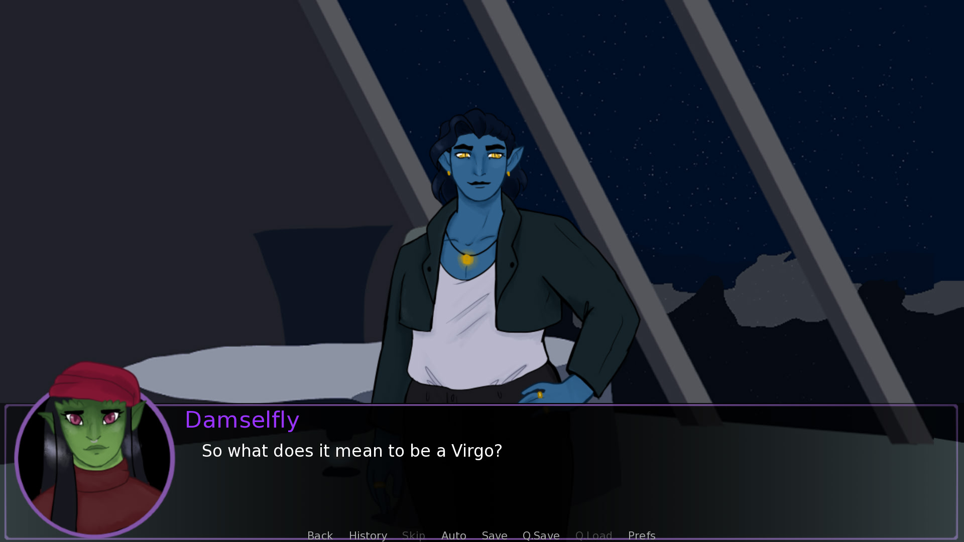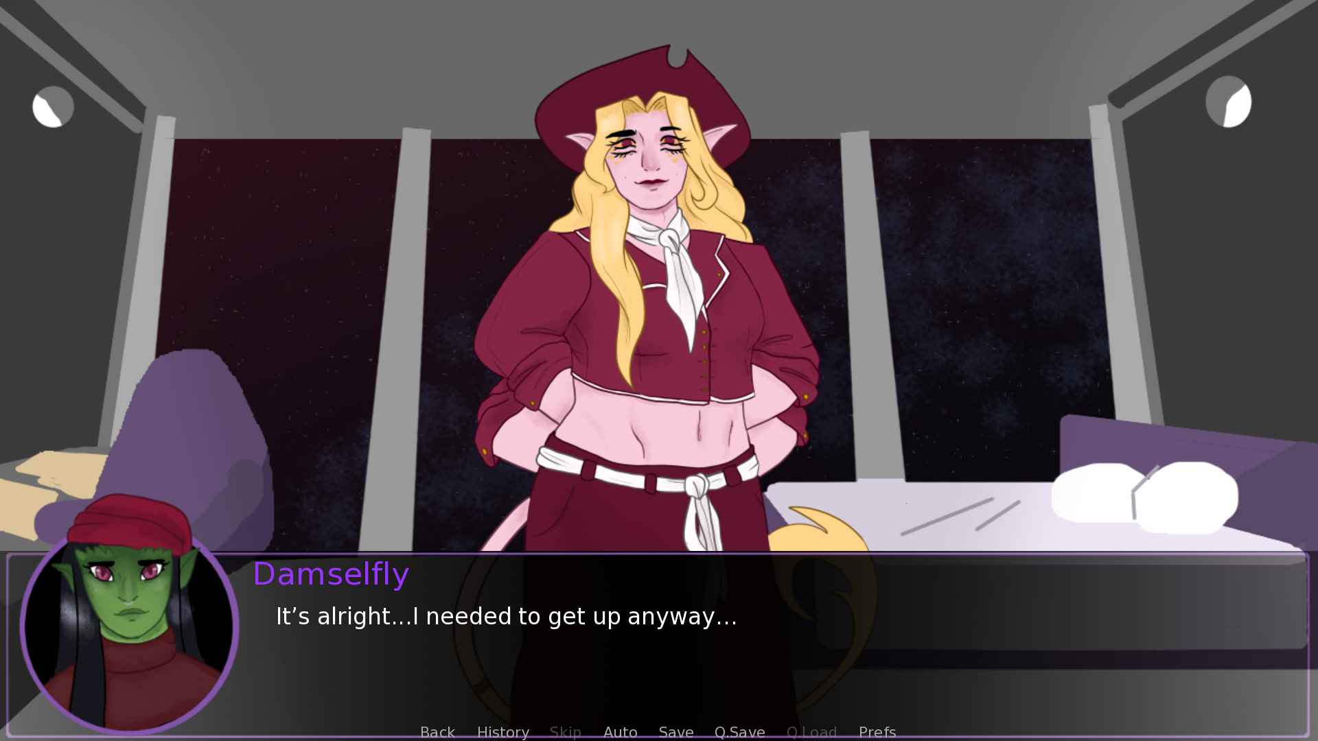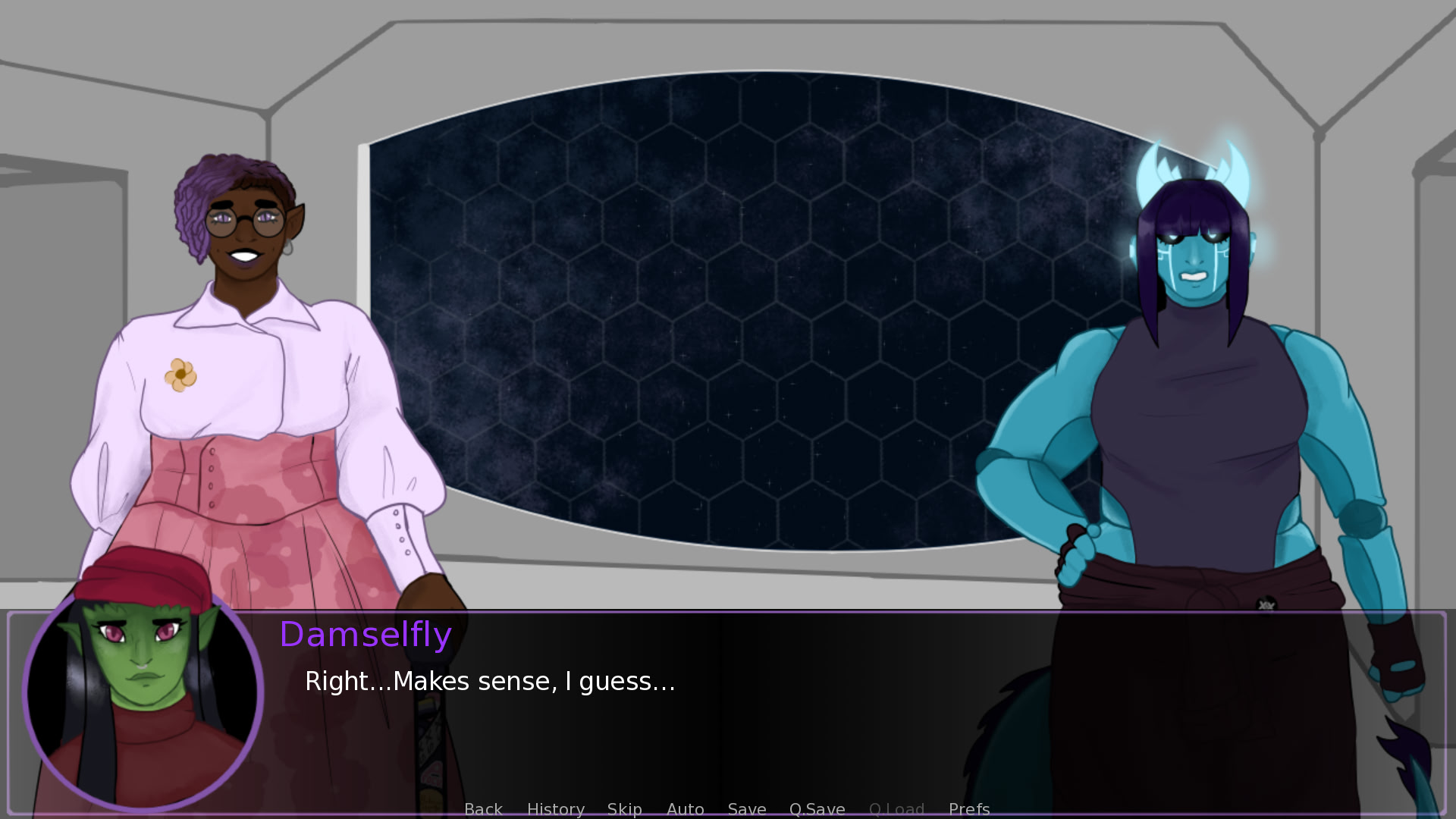 Damselfly is a short visual novel following a navigator trying to balance her job working for a shady company with the trust of her close friends. The player can explore her relationship with these friends and decide whom to trust, whom to keep in the dark, and whom to have a deeper relationship with.