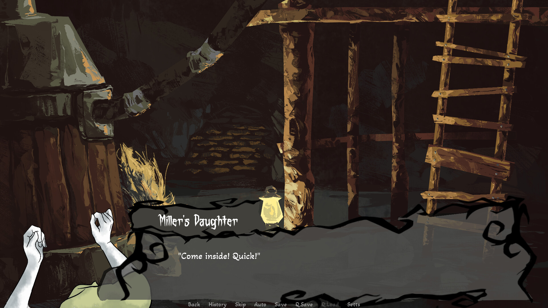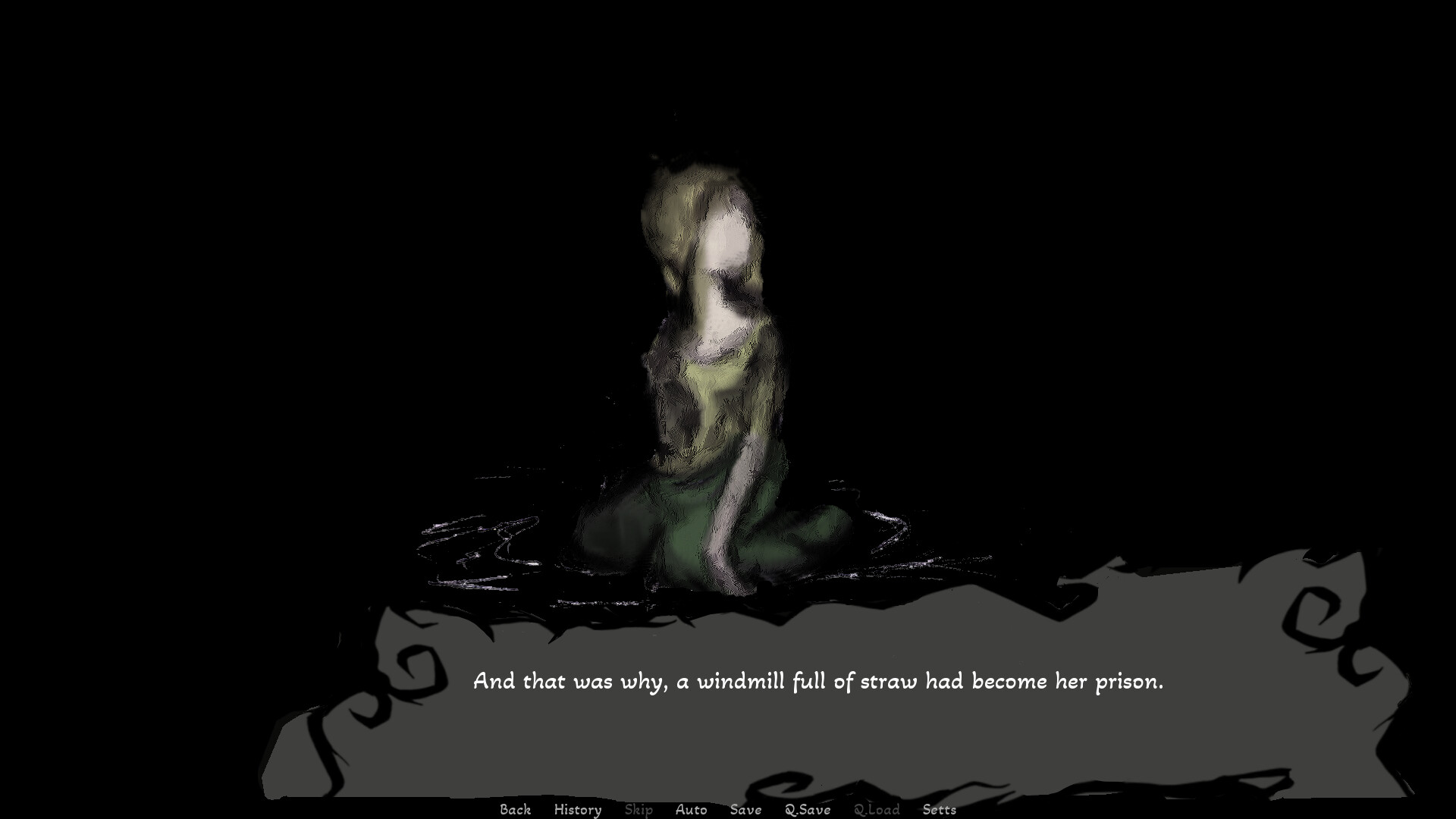 The miller's daughter is imprisoned in the windmill by her own father and chosen husband for the impossible task of "spinning gold" and under threat of literal death. To make matters worse, there is a lurking, haunting monster creature, standing right outside her window - her only escape. Her chances at this game of choices are like the spun thread trapping her wrists, as her fate lies on many hands... and none are hers.