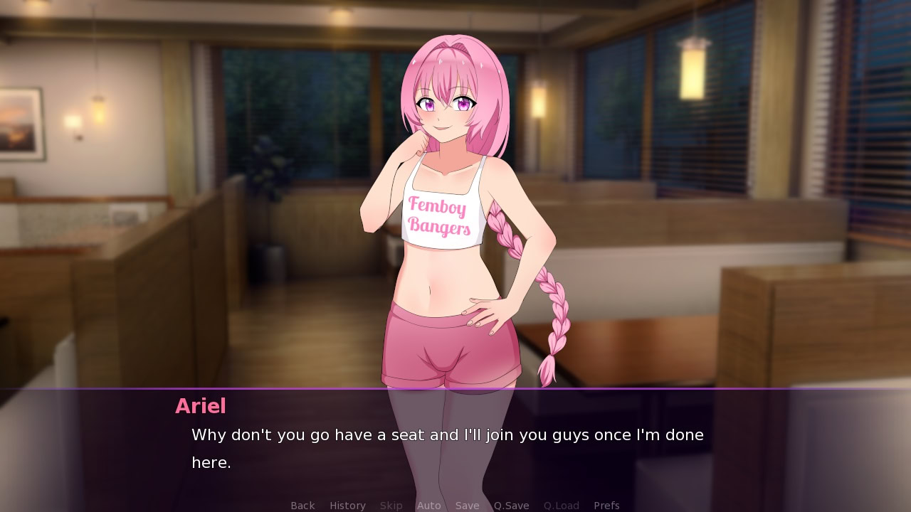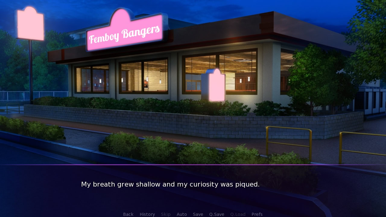 Friday night at 10pm and you feel like getting out of the house. A drive around town looking for an open pizza place will have to do, but your search is soon interrupted by a bright pink light. Like a moth to a flame, you are drawn to a banner that reads: "Femboy Bangers". With your curiosity piqu...