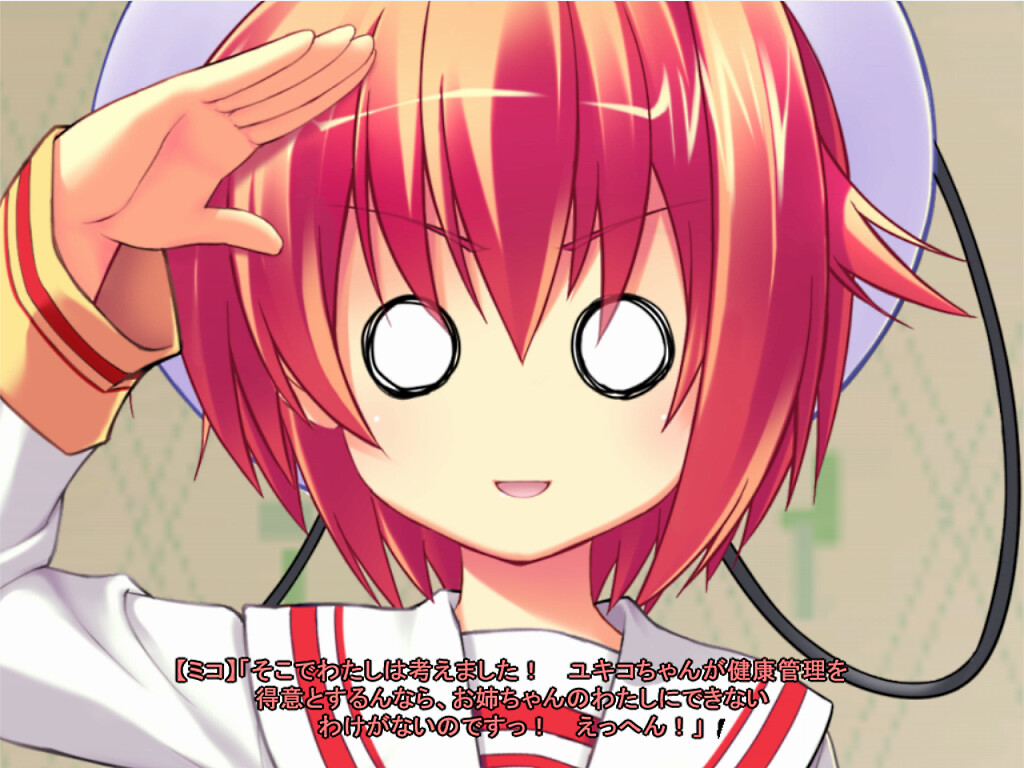 Hitokuchi Dake no Yuuki / A Single Bite of Courage is a very short story featuring the game's protagonist and Miko as they get ready to eat breakfast.