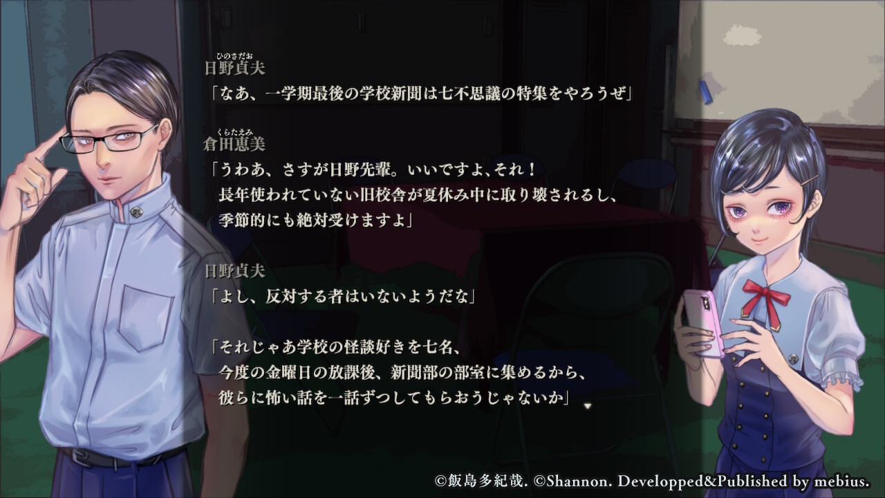 Sakagami Shuuichi, a first-year student and member of the newspaper club, decides to listen to scary stories told by seven storytellers assembled by his upperclassmen to produce a feature on the school’s seven wonders for the school paper.