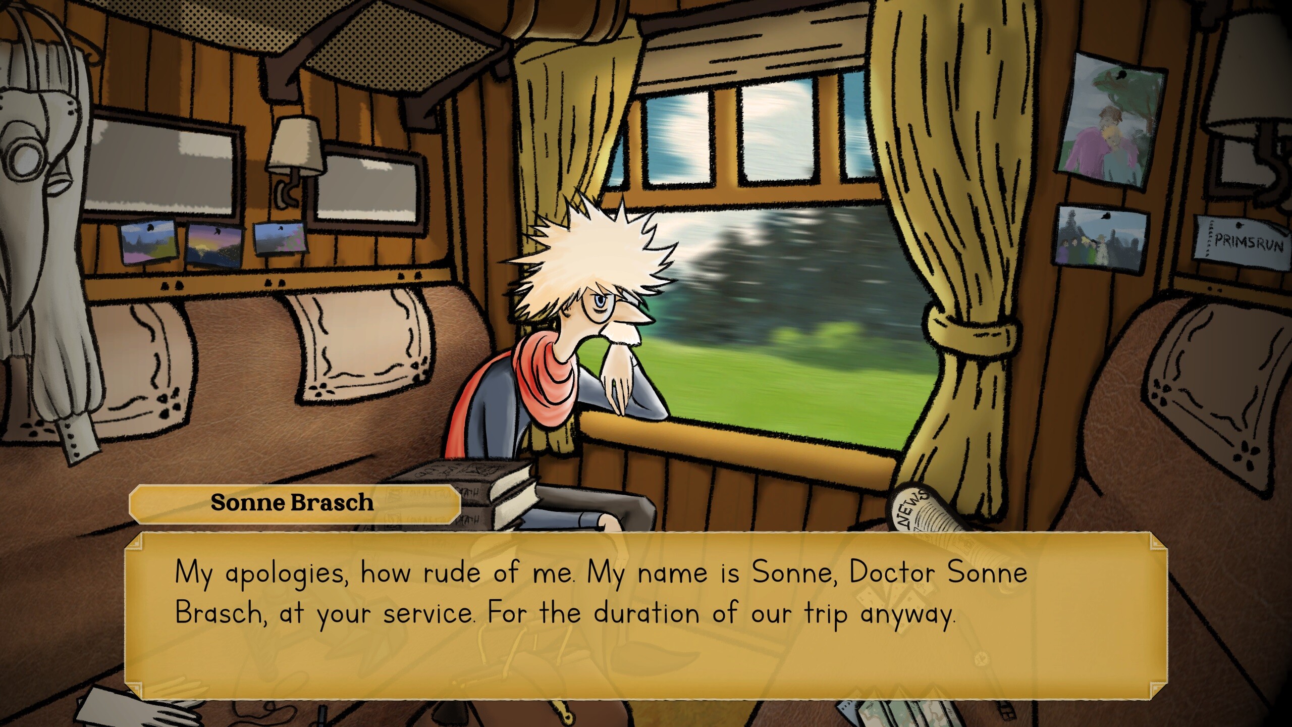 Doctor Sonne Brasch has been traveling on this train for a long time. Happy to finally have someone to talk to, he is eager to talk about any of the things scattered around the train cart, passing the time until the train's next station.