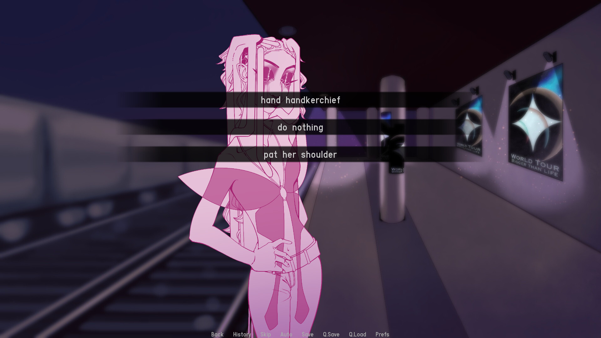 You made your way back from work and spot someone at this desolate train station. A conversation ensues... Itch.io]