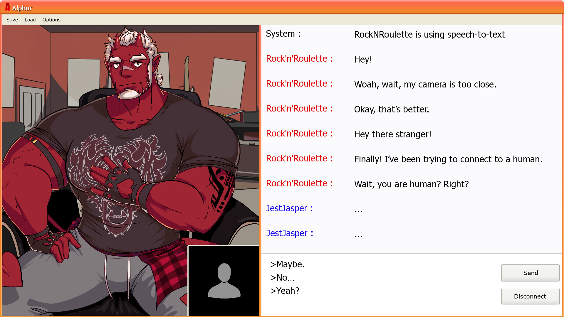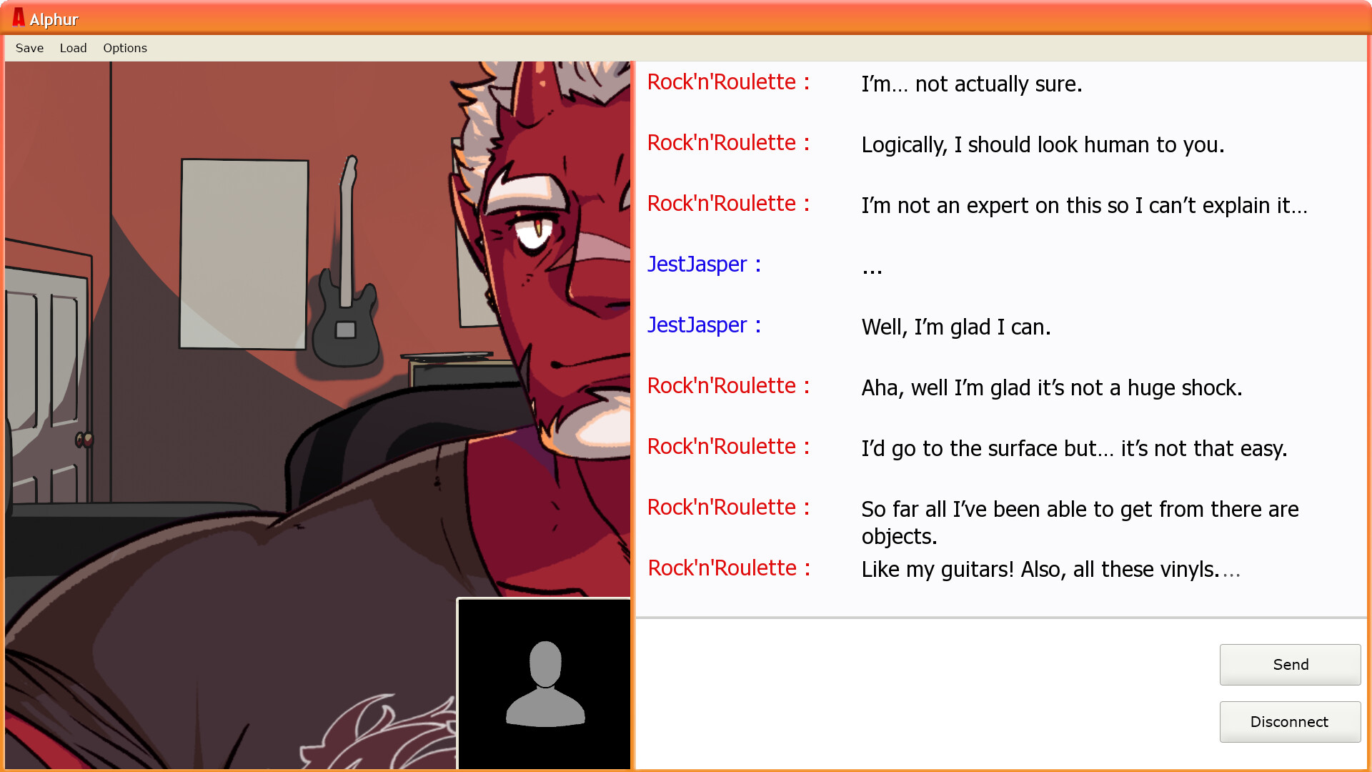 You download an old anonymous chat program called 'Alphur'. Going through various topics and meeting other people, or sometimes no one even connects.