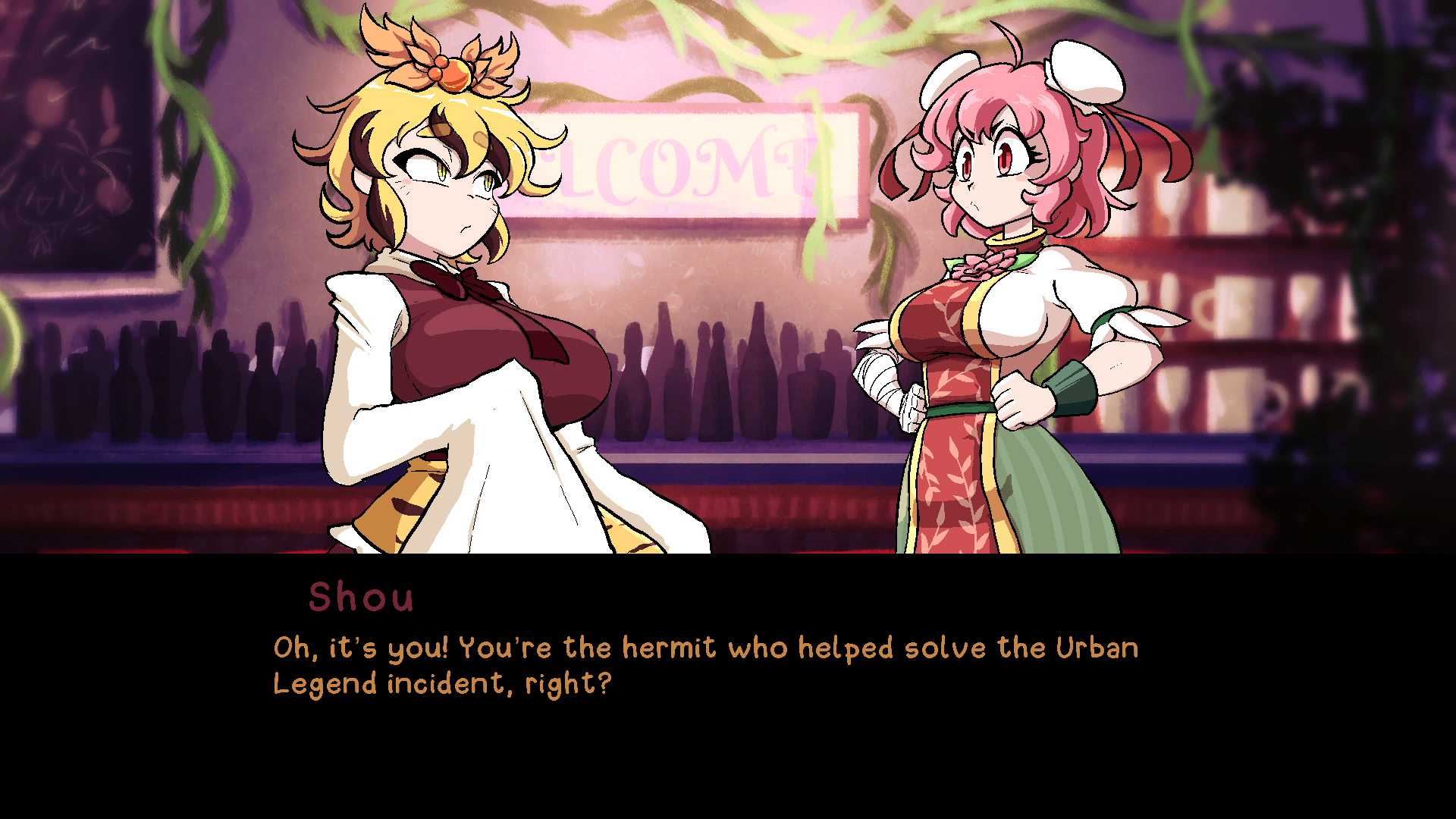 How does the highly revered Buddhist Monk Shou Toramaru spend her nights? ...By drinking at bars! Explore Shou's past and present as she helps different Touhou characters sort out their relationships in this visual novel (with minigames)! itch.io]