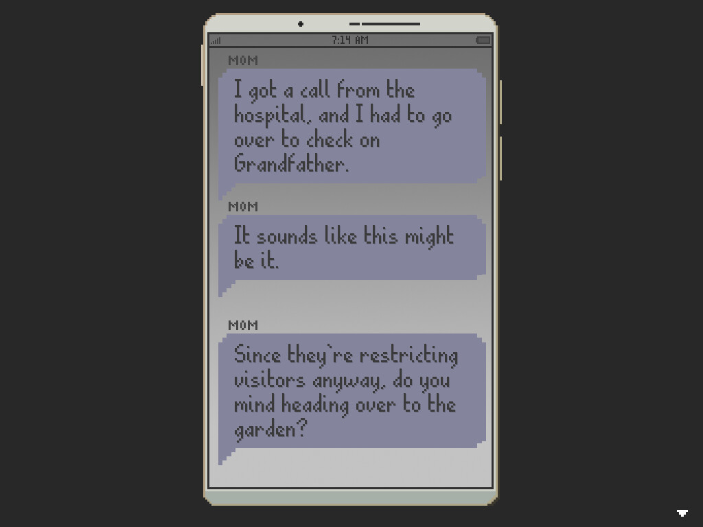 Ryn is back home after a colossal screw-up. With her parents busy looking after her dying grandfather, Ryn is all alone with both her thoughts and some severely overgrown garden statues. But digging into the yardwork might be just what she needs to get through some tough feelings. itch.io]