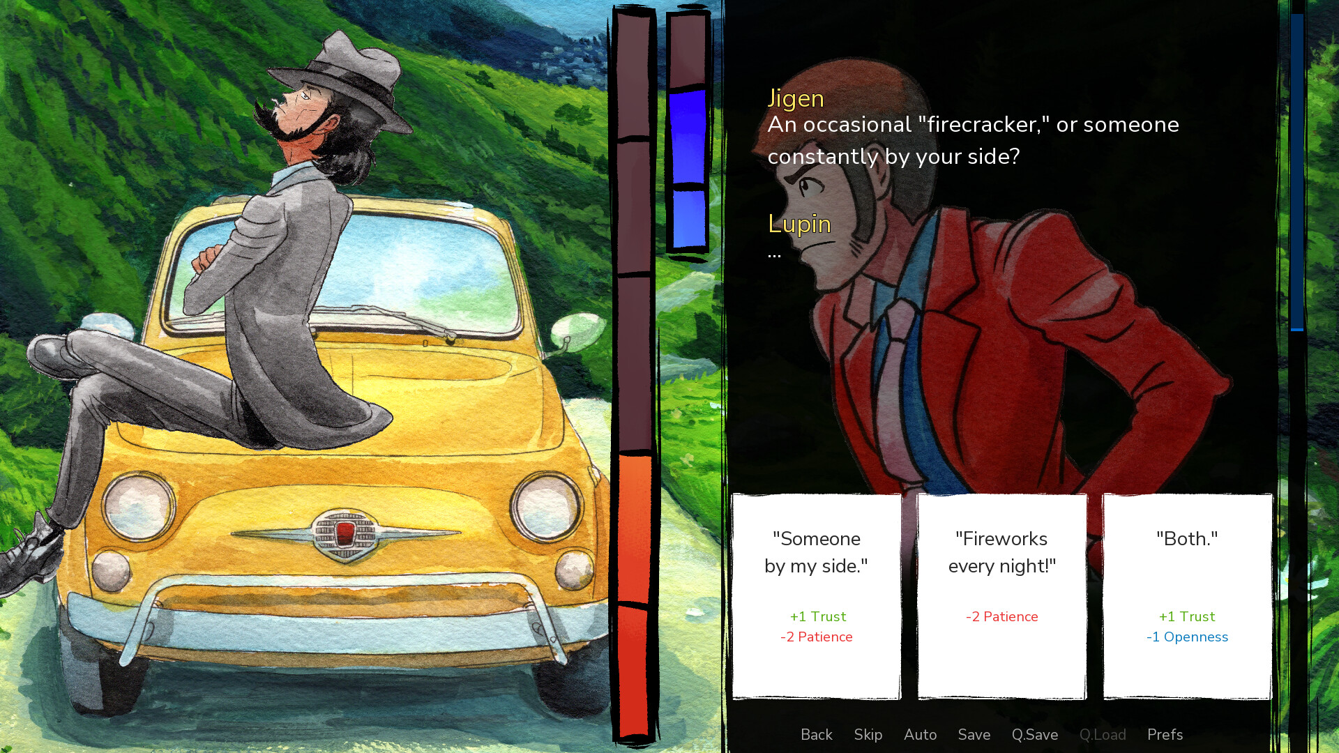 From the fans that brought you Is Lupin Still Flirting, comes another tale of master thief Lupin the Third, as he sets his sights on cool gunman Jigen Daisuke. Keep social stats balanced as you help Lupin win over Jigen’s trust, without getting Jigen fed up with Lupin's constant BS.