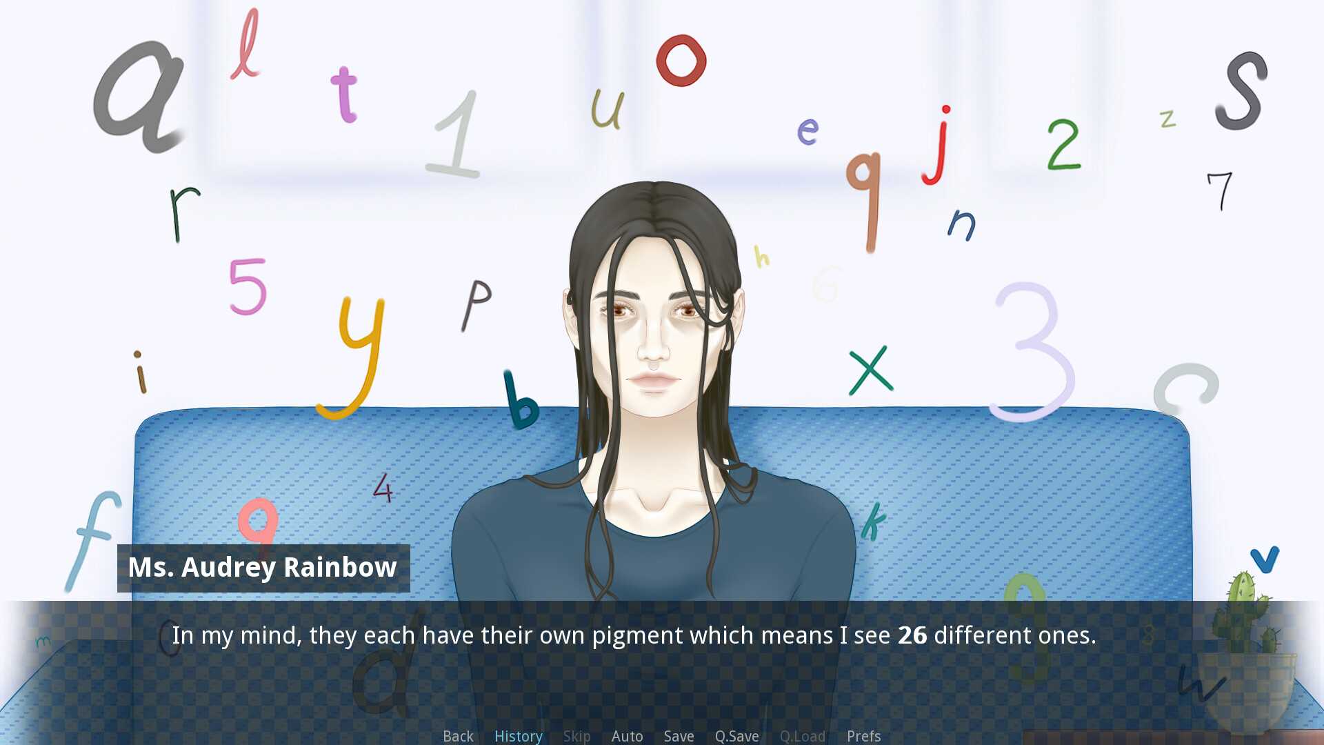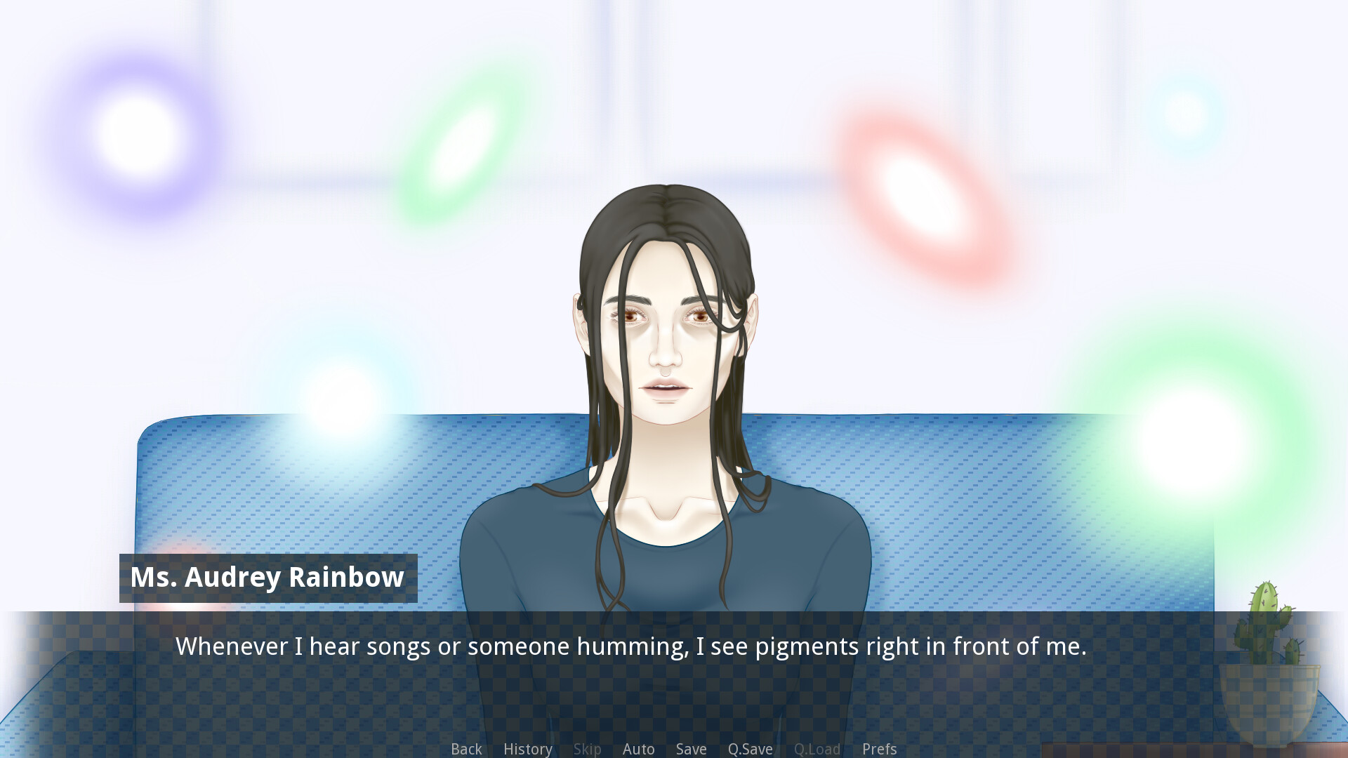 Thoughts In Color is a serious game about a session between a psychologist and their patient, Audrey Rainbow. Take on the role of the psychologist to learn about Audrey's daily life and the symptoms that she's felt throughout her life, and try to figure out what her condition is.