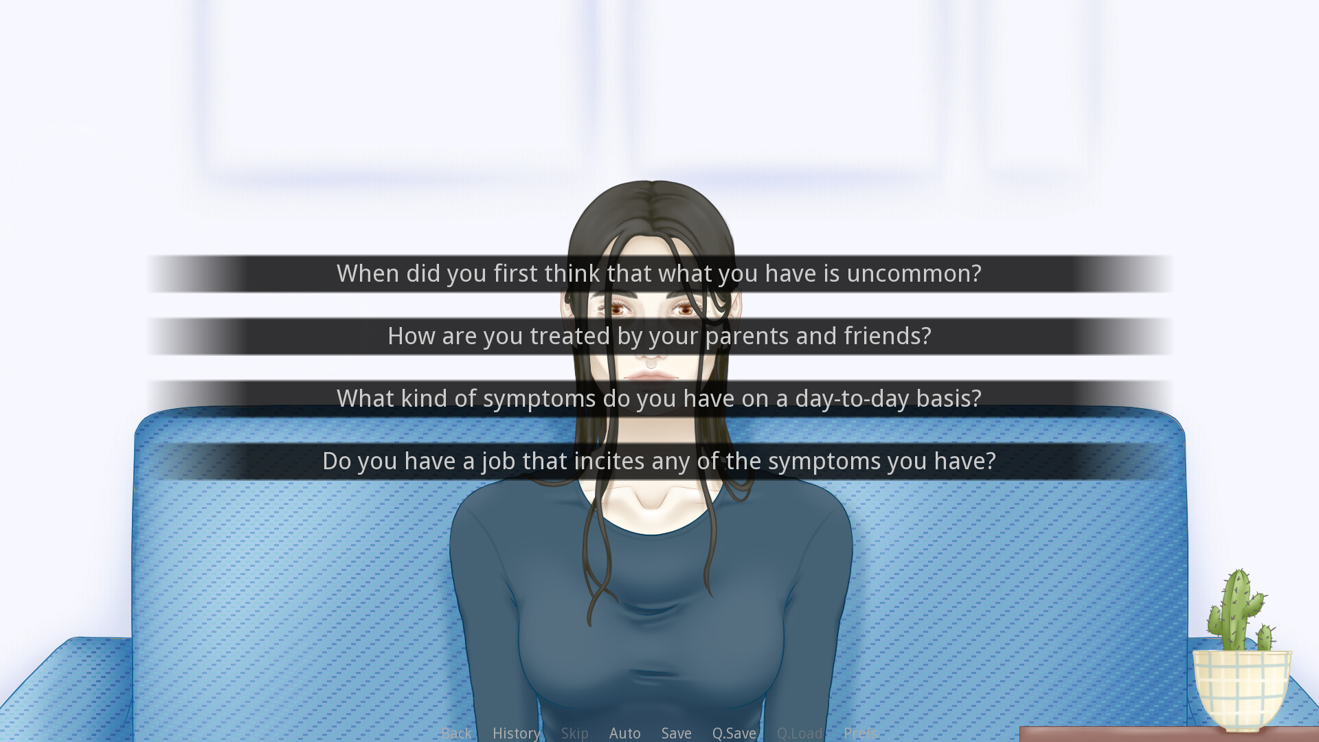 Thoughts In Color is a serious game about a session between a psychologist and their patient, Audrey Rainbow. Take on the role of the psychologist to learn about Audrey's daily life and the symptoms that she's felt throughout her life, and try to figure out what her condition is. Itch.io]