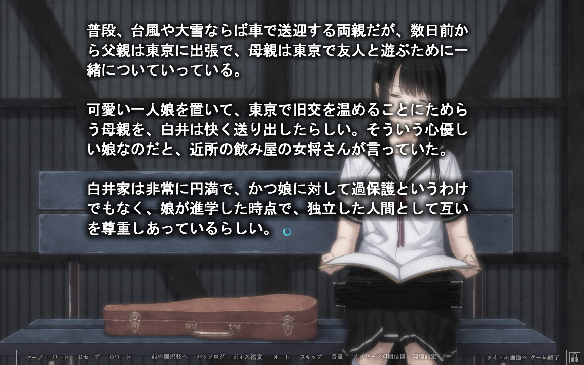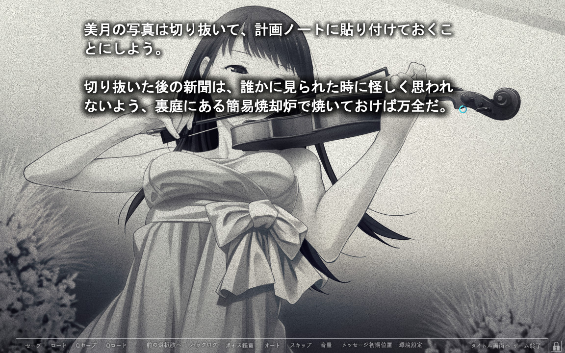 I will now carry out what I've always imagined. My plan is perfect. Now I just have to choose a girl to entrap in my scheme. Anyone will do, as long as she's not boring. For example, the girl walking in front of me with the long black hair. I don't desire a brightly shining summer. What I crave are days filled with a girl's screams and despair.