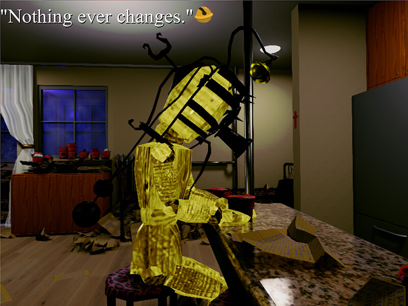 A featureless doll is locked in an apartment, and must write stories that will always be rejected, and must eat feces out of instant-noodle containers despite having no mouth, all for the Forgiveness Machine.