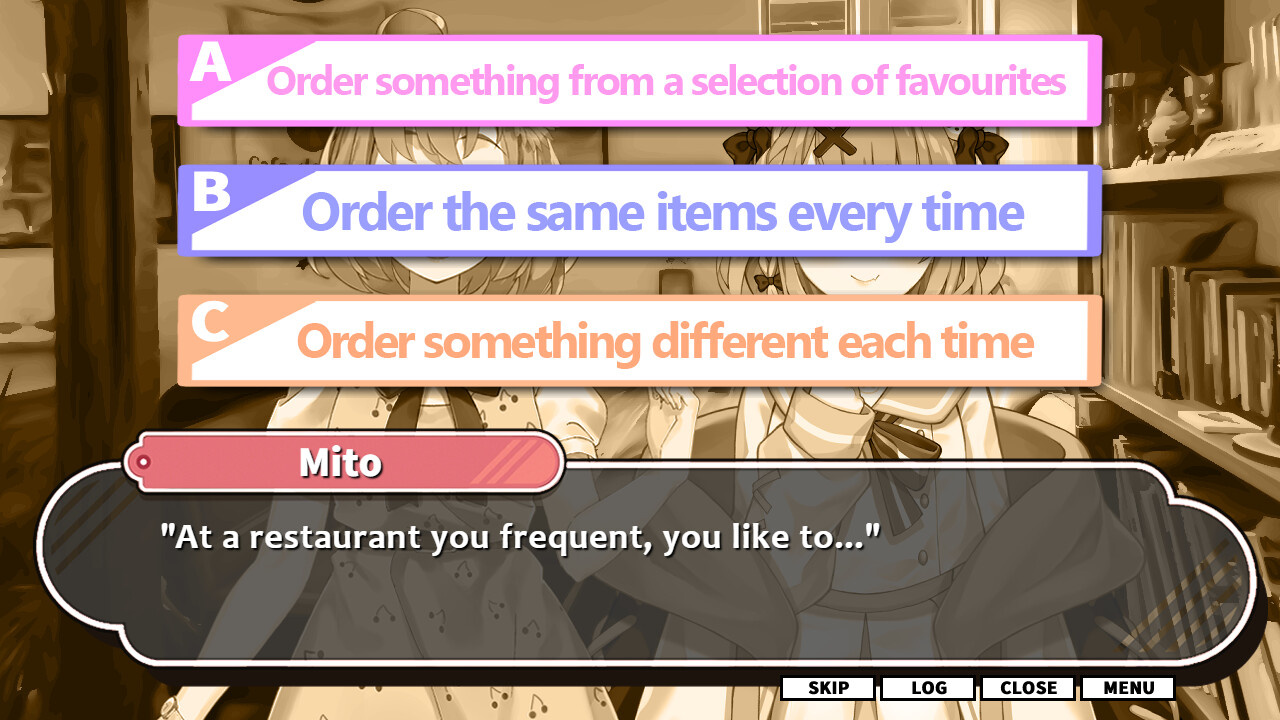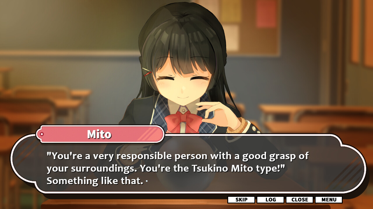 The class president Tsukino Mito tries to run a personality test on the player by using a crystal ball that she purchased for 20,000 yen, and the player gets trapped inside the crystal ball, as soon as Mito starts her ritual. There, the player experiences a series of short stories involving multiple fictional settings. For example, a story where you become friends with a VTuber, and a story where you work as a producer of an idol. You’ll make several choices along the way, and once all the short stories/tests are complete, you can escape from the crystal ball’s world.