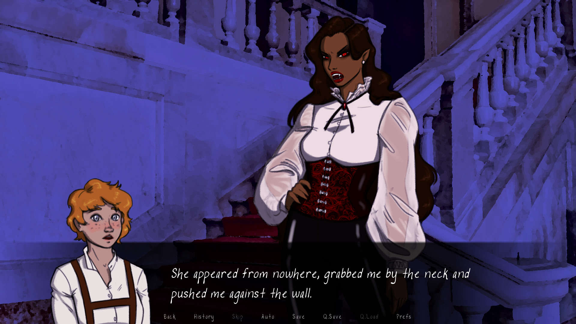 "Stuck by their meeting years ago, the vampire hunter approaches the manor... but she doesn't intend to capture anything but the vampire's heart" Itch.io]