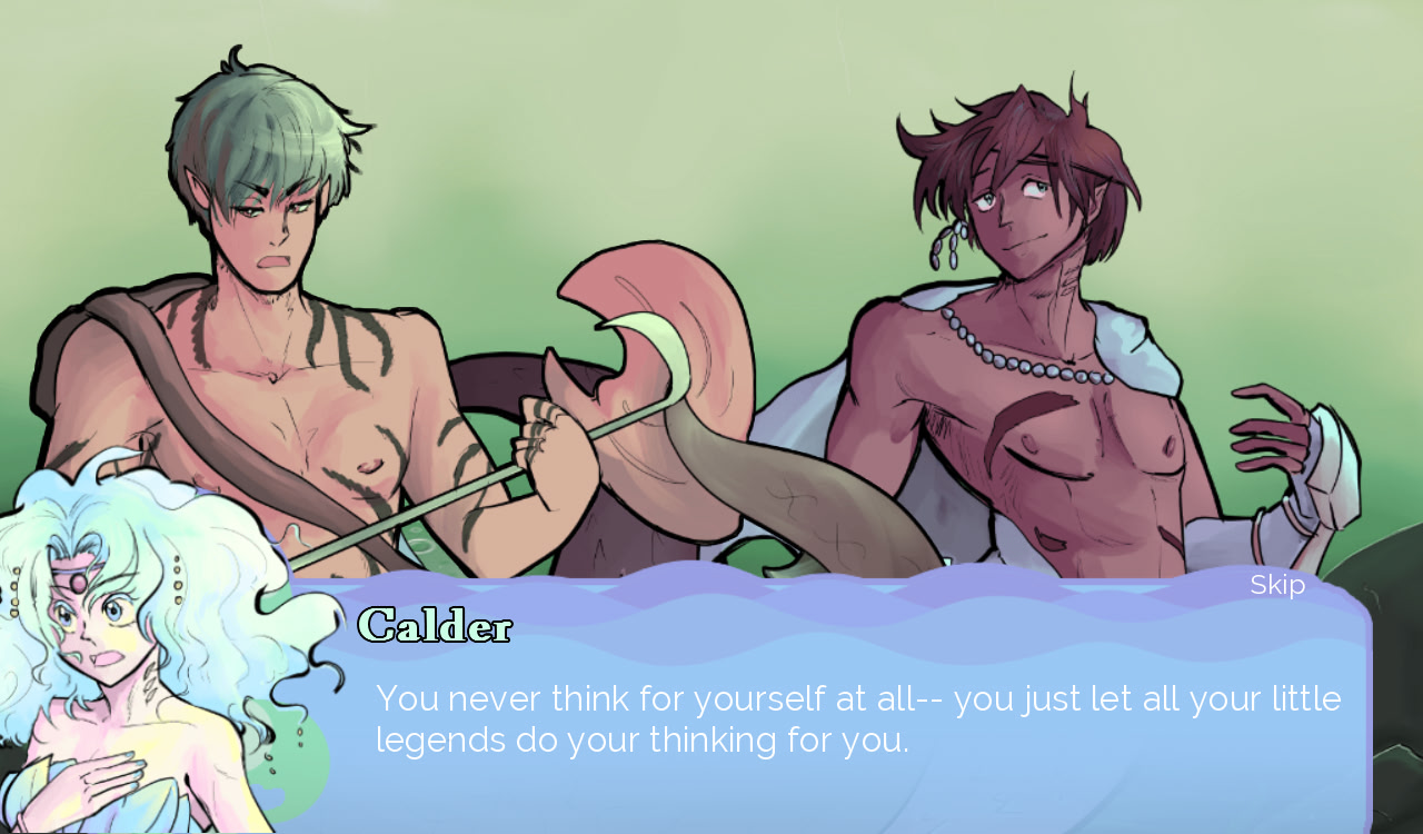 A mermaid princess wonders about what lies in the great beyond. Does she decide to go out there and see for herself? And who will she find helping her along the way? The mysterious loner of a merman, or perhaps a reliable childhood friend? Itch.io]