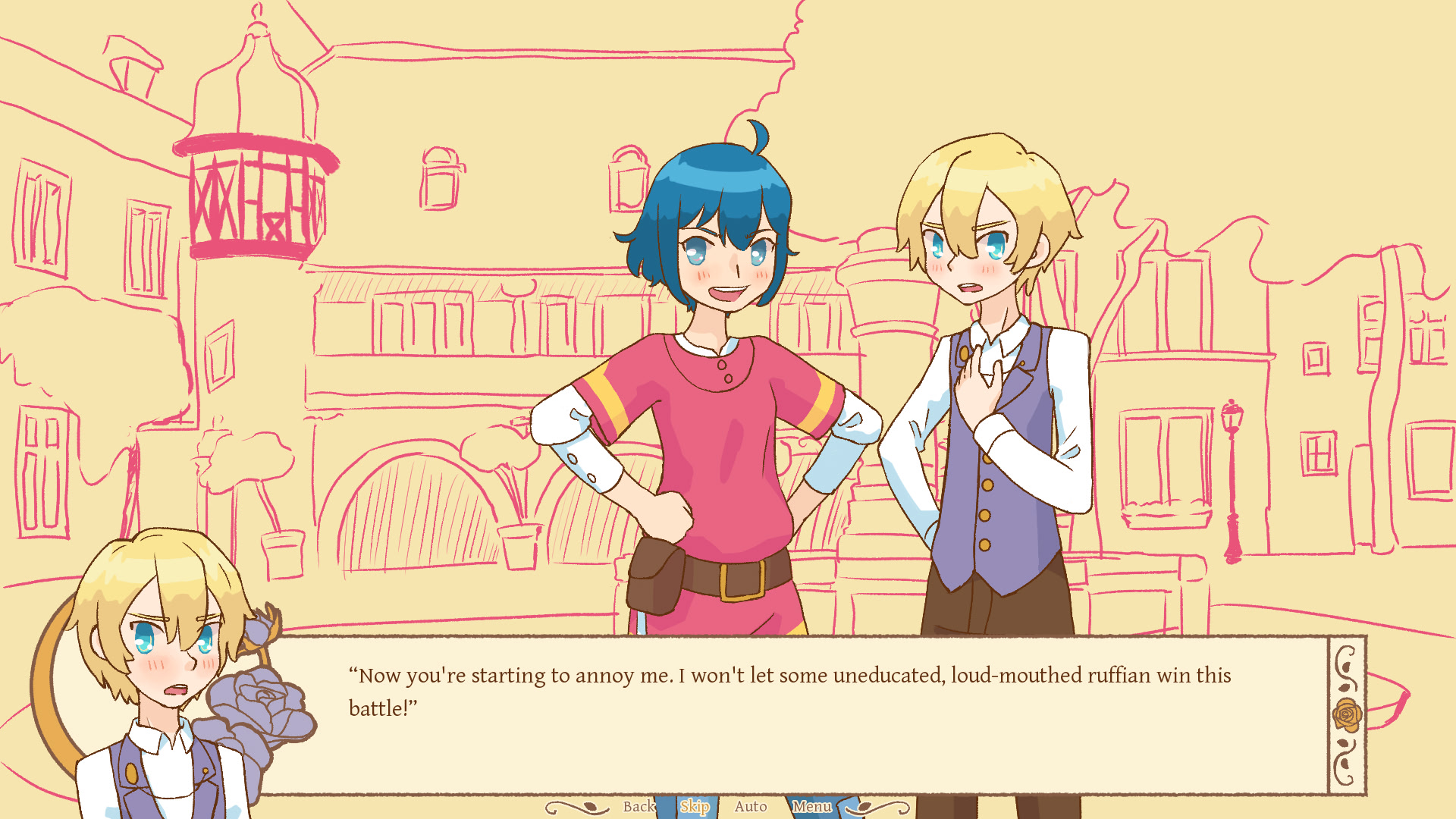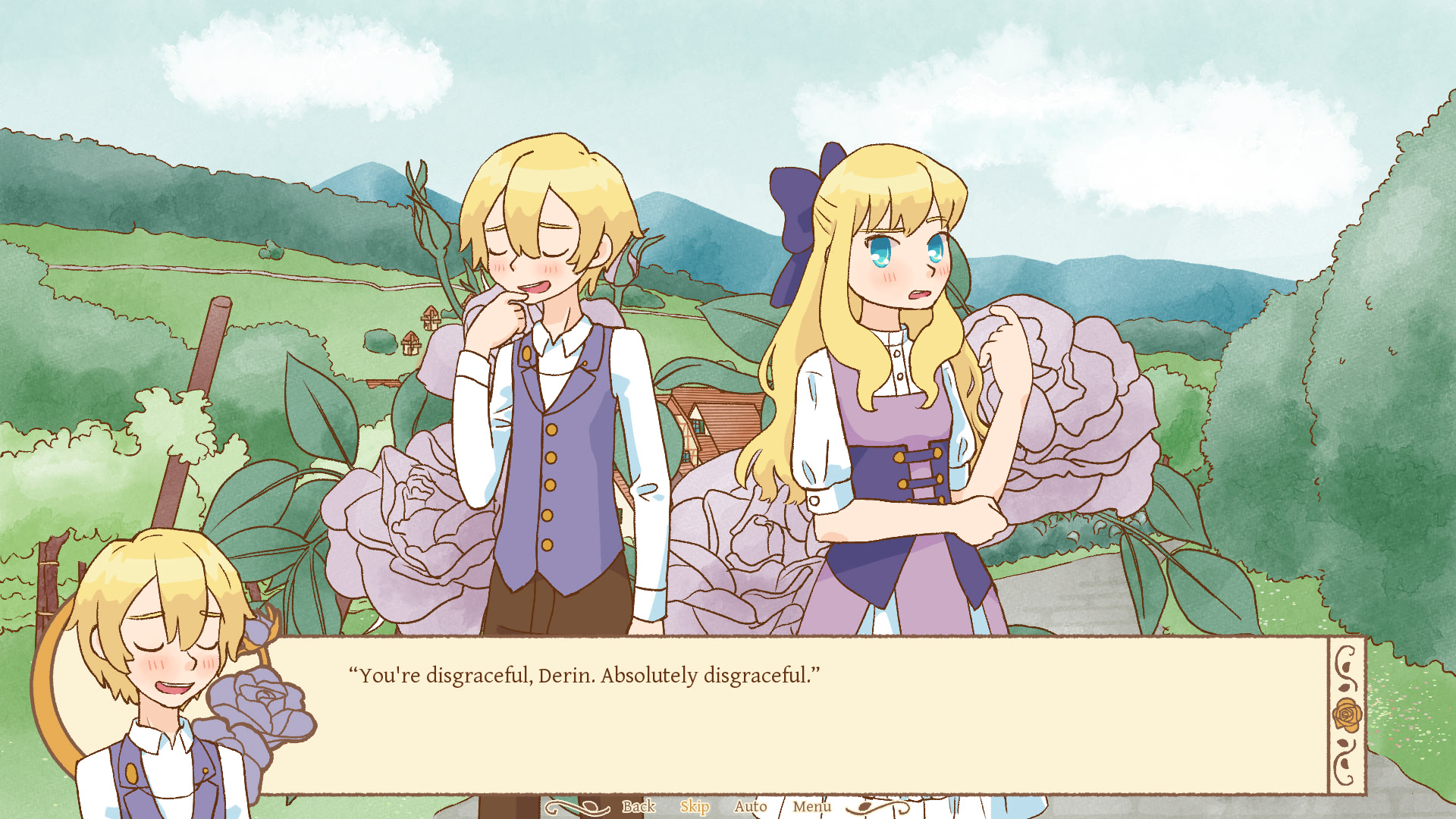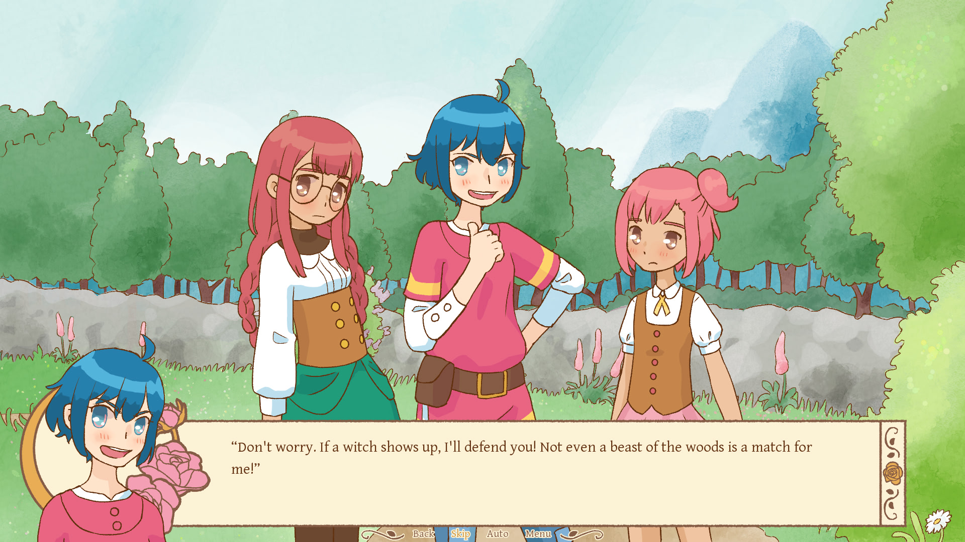 Rose Knight and Thorn Witch is a fairy tale yuri visual novel series. In Chapter One, The Girl who Wanted to Become a Knight, Derin Larkspur longs to leave the Thistle Village behind and journey to the Academy where she will train as a knight. When she hears rumors about a witch living in the wood...