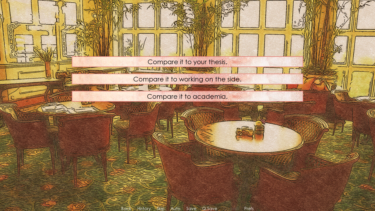 You're a postgrad student who's just gotten a job at the swanky Café Milan -- but things here are not quite as they seem. Team up with your chosen love interest to figure out what's really going on.
