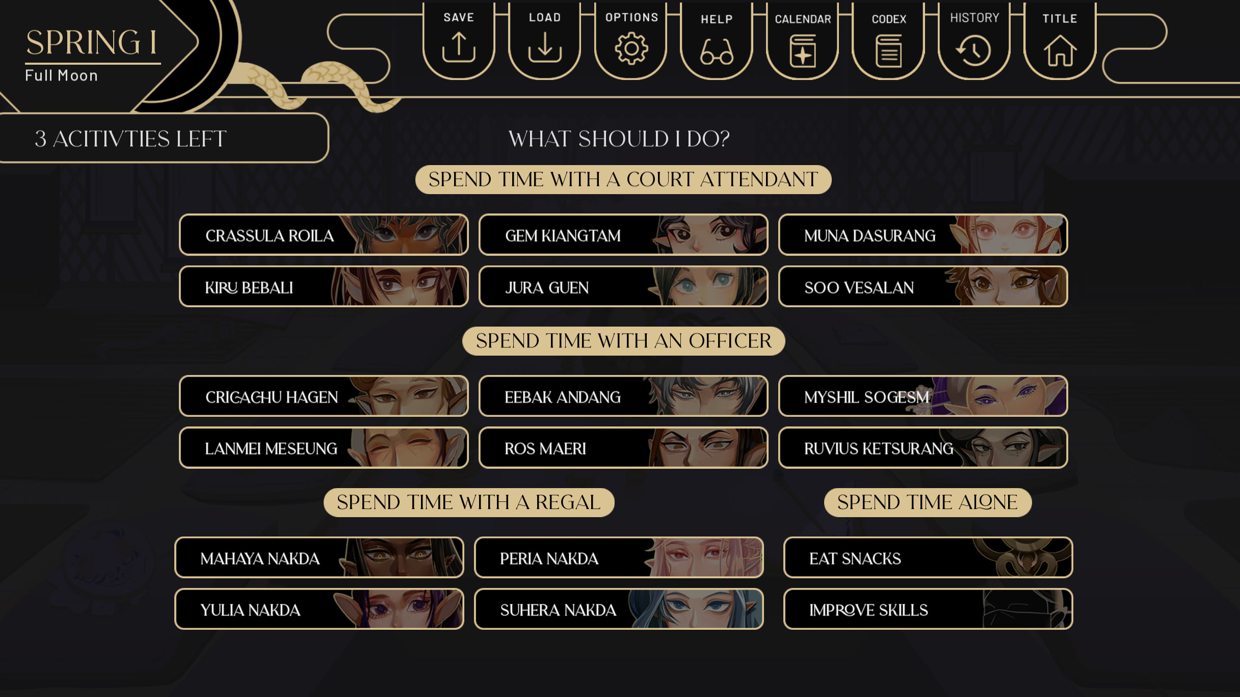 Winds of Ambition is a stats-raising visual novel, where every choice can result in the most fatal outcome. The objective of the game is keeping the protagonist alive for 12 seasons, and marry one of the four Regals.