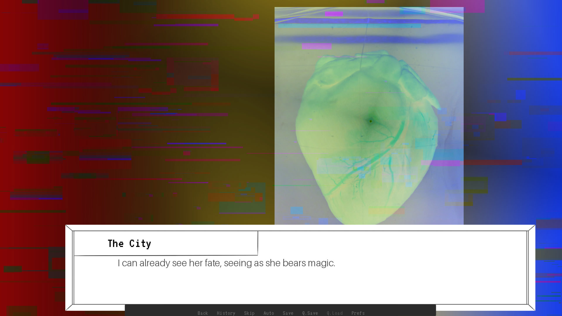 In Marrow City, a woman embarks on a venture to the City's Heart. A Tagalong joins her, an observer to her journey. A Knight commits murder for the very last time. A TV Broadcast reports without seeing, staying with them until the very end. Promise to Remember, the City loves all. itch.io]