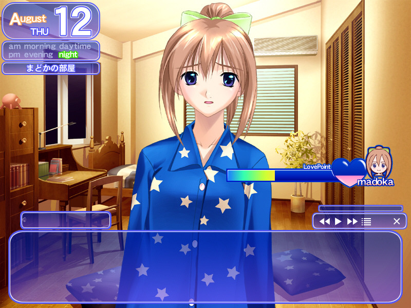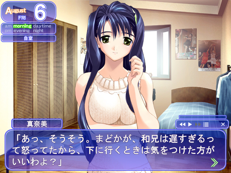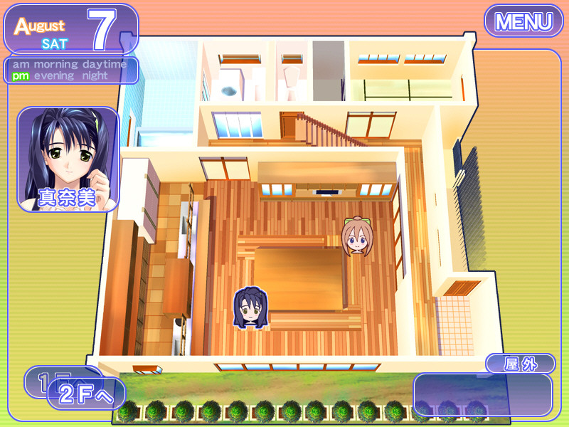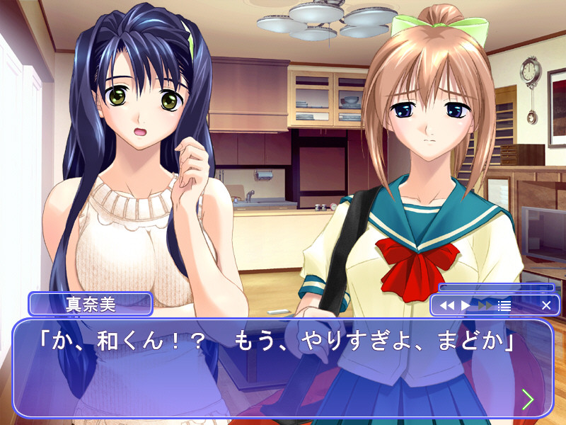 The main character is Tohno Kazuya, a senior in high school who lives at home with two girls his family took in ten years ago. One is slightly older than he, named Manami, while the other is slightly younger than he, named Madoka. The three, for all intents and purposes, live by themselves in a rather spacious house in the suburbs, since Kazuya's father works abroad and his mother is deceased. The setting is in the middle of summer break, beginning in June and ending in August, and the premise of our story is the budding...attraction between Kazuya and either Manami or Madoka.