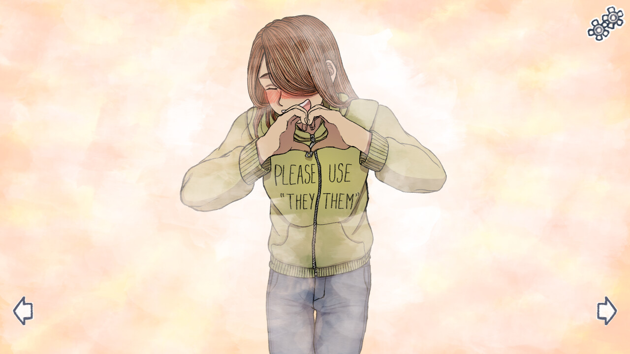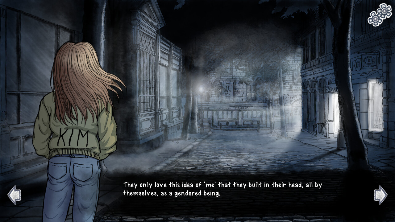 Our hero, a non-binary person, gets lost in their dark rumination, following the revelation that their girlfriend, Kim, no longer wishes to use "They/Them" pronouns and instead decided to fully go by "She", and to fully assume herself as a woman. itch.io]